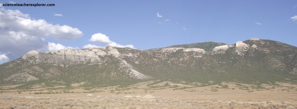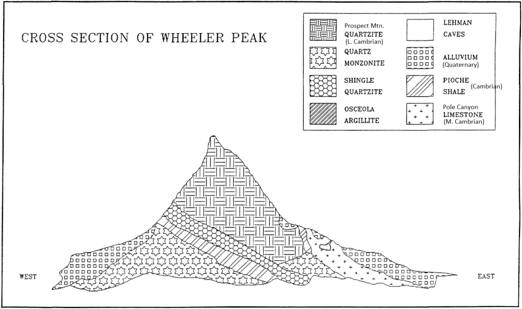 Pictured above, both Jeff Davis Peak and Wheeler Peak is made of the Prospect Mountain Quartzite. This quartzite formation, like all others, was originally sandstone, and probably laid down in an environment like todays Sahara Desert. It dates from the beginning of Cambrian times, or about 600 million years ago. Later it was covered up and squeezed and pressurized to create quartzite. This quartzite is pinkish gray to light olive gray on fresh factures, and it weathers to a rusty brown or tan. This is the most dominant formation in the Snake Range, both north and south. It’s about 1,500 meters thick.