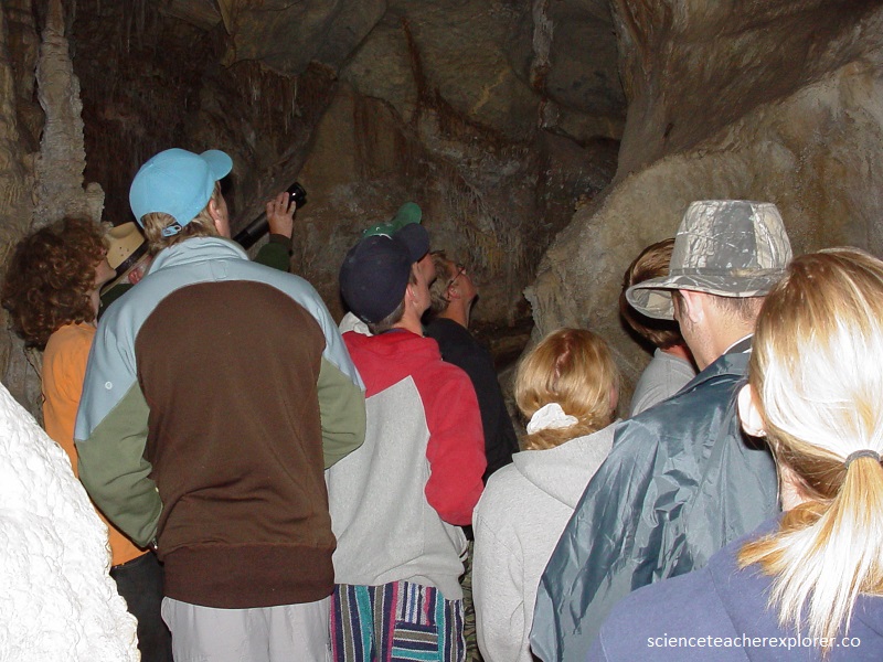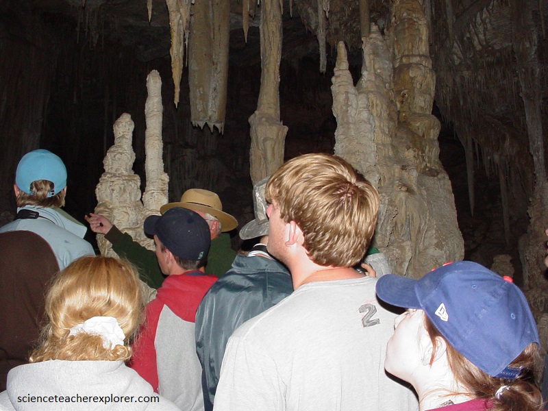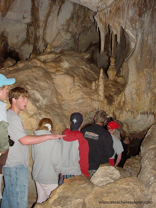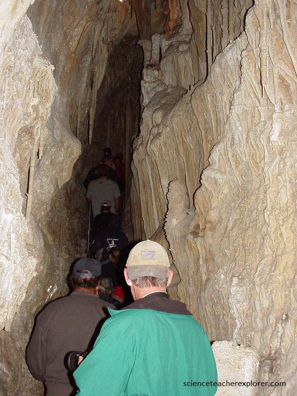 It took us about 2 hours to go through the cave. The inside temperature of the caves was a constant 11 degree C. (52 F), so we all wore jackets. Also, the humidity was nearly 100% all the time. Note, these deposits are not caused by the simple evaporation. Instead, as a water-drop clings to the ceiling, it loses some of it’s CO2 because there is relatively little CO2 in the cave air. This causes all of the reactions noted above to go backward. The solution becomes less acidic; the water hold less dissolved limestone; and the original mineral reappears as a small ring of solid CaCO3.
