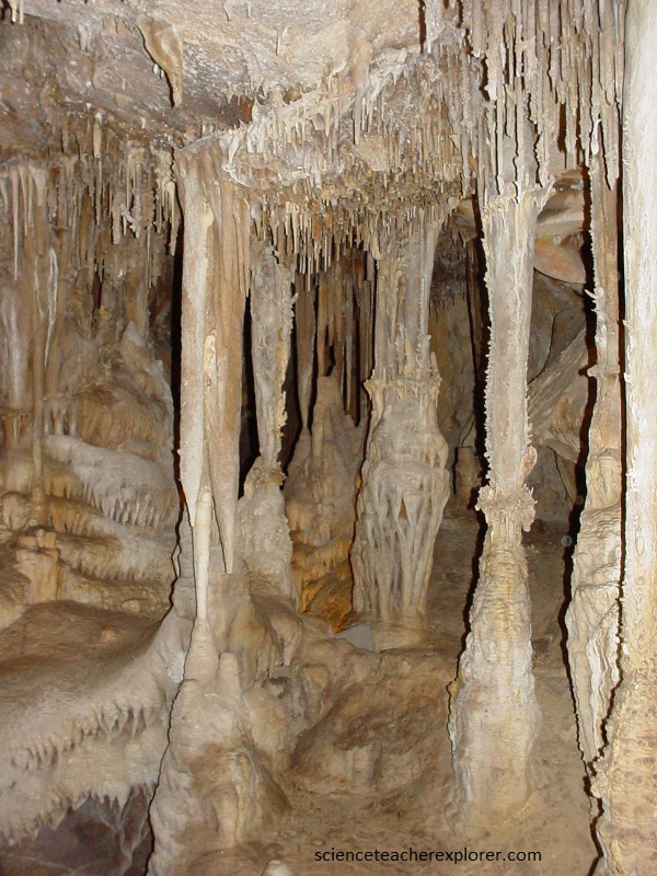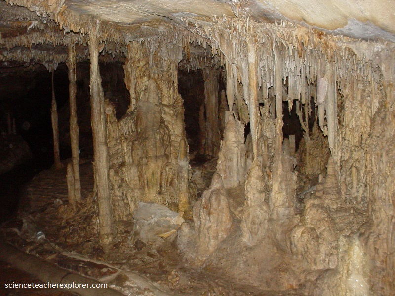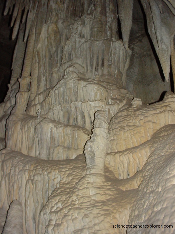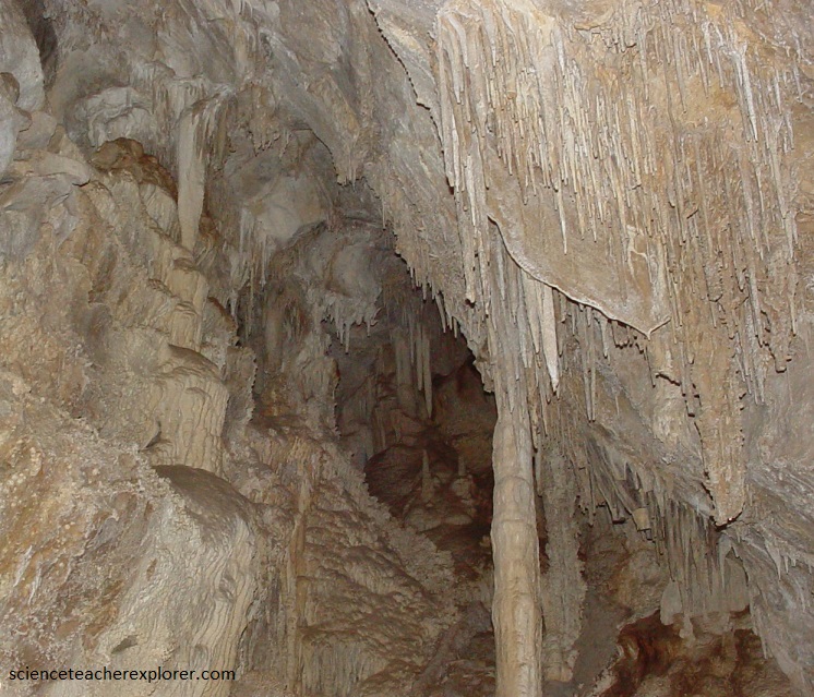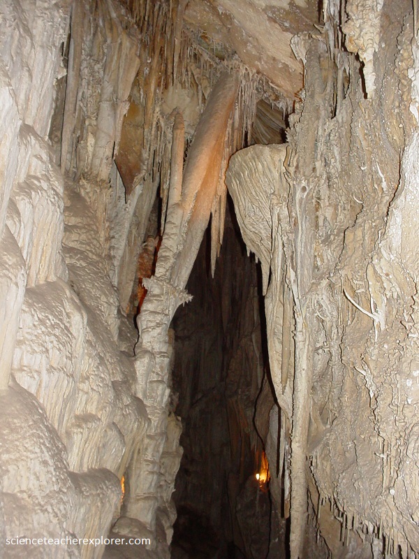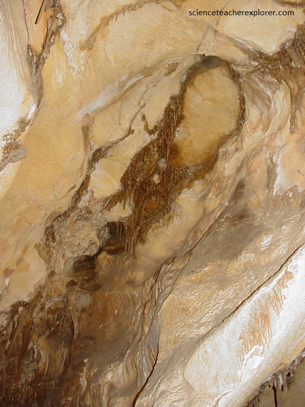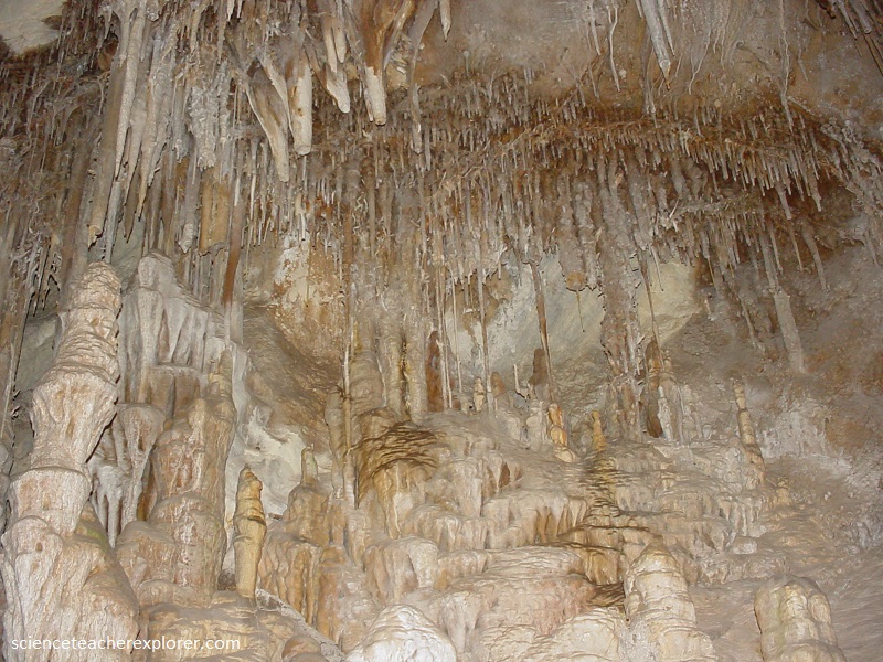 While there is some limestone or marble still being dissolved in the water, the smaller amount of water is exposed to the air, thus some of the water evaporates. This leaves the solids, which it has just dissolved on the way down, on the ceiling or floor of the cave. These end up as icicles-like features on both top and bottom. Those emanating from the ceiling are called “stalactites; those from the floor are called stalagmites. There are many other depositional features in the cave, each with it’s own descriptive name. However, overall they are called speleothems, (pictured below).