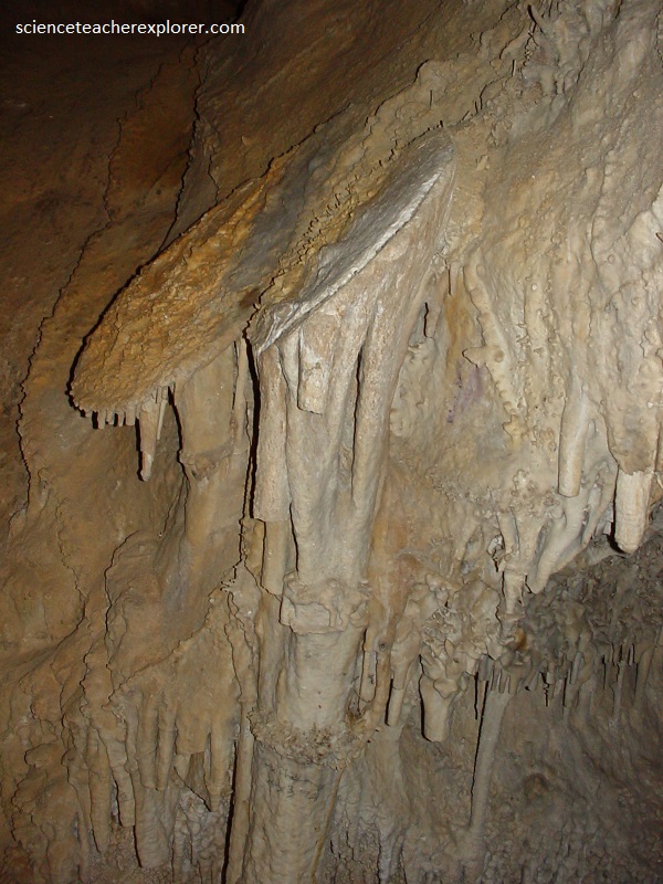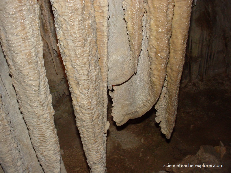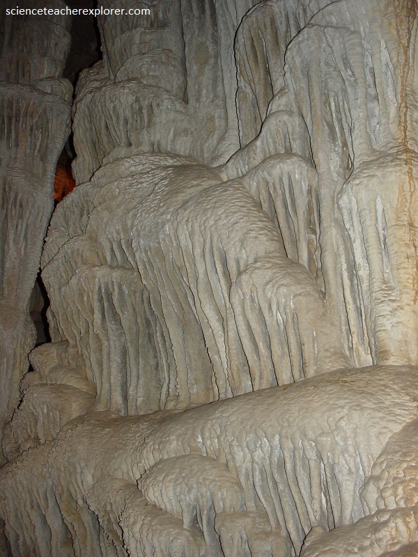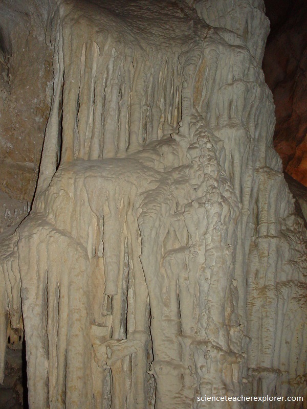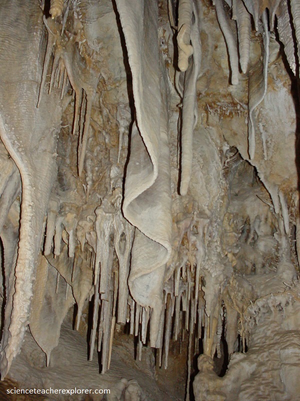 Pictured above, these structures begin to form on an inclined ceiling when the drops of water trickle along a slope. Gradually a thin sheet of calcite grows downward from the ceiling and hangs in decorative folds like those seen on drapes. These speleothems are called cave-drapery or cave-curtains.