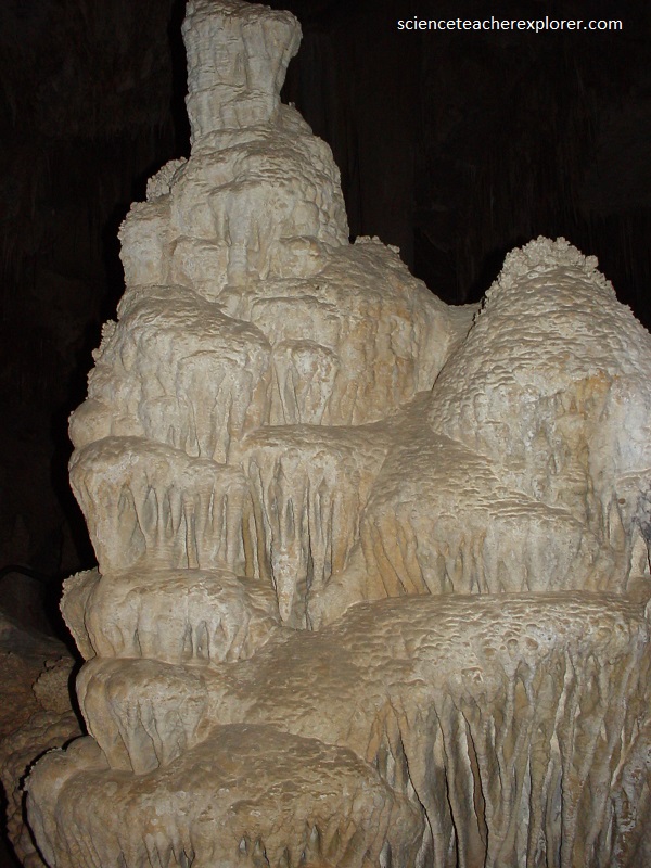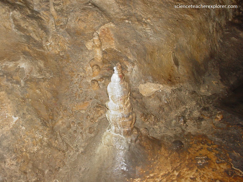 Pictured above, since travertine is a common mineral found in the cave, then gypsum maybe present in a dissolve state in water. The white on this stalagmite is more than likely a gypsum precipitate. Gypsum is a magnesium sulfate mineral.