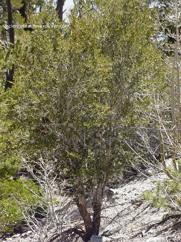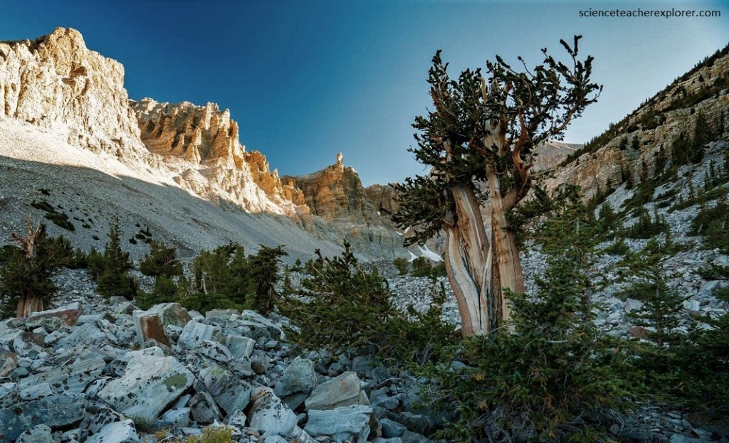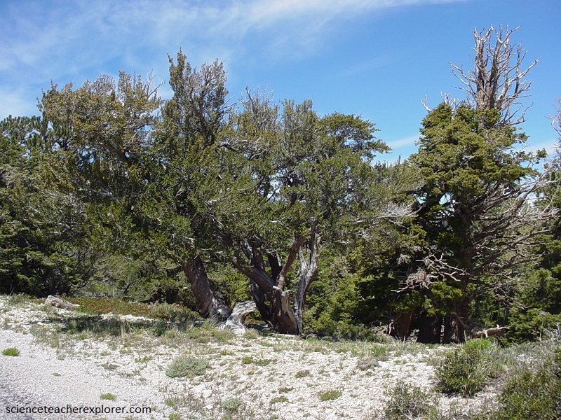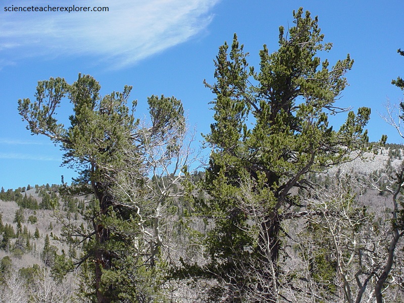 Pictured above, Pinus longaeva, the world’s longest living tree, has been known to live for over 4,900 years, (found here). It usually grows between 9,000 and 11,500 feet (3,000-3,800m) elevation although specimens can be found at lower elevations. Bristlecone grows on exposed rocky sites above the continuous forest. They will grow on the quartzite of Wheeler Peak glacial moraine. It forms woodlands alone or with limber pine and Engelmann spruce. At timberline this tree will form krumholtz. Needles are short, one-inch long, and in packets of five. The dark green needles surround the twig and tufts may extend back a foot (30cm) or more along the branch. Needles can last up to forty years. Bristlecones survive longest where conditions are most strenuous. They are slow growing and easily out-competed by faster growing trees so they have adapted to the harshest conditions where other trees won’t grow.
