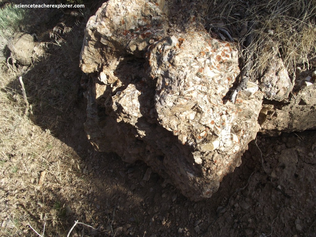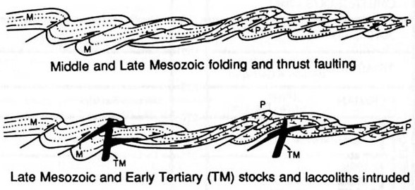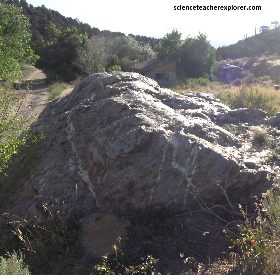 Imaged above, the rocks in the park were further changed during a mountain-building event around 200 million years ago, during the Mesozoic Era. This event, the Sevier Orogeny, pushed layers of rock on top of each other, doubling the thickness of the crust. The layers at the bottom of the stack were metamorphosed slightly where sandstone changed gradually into quartzite (i.e. Prospect Mtn. Quartzite), limestone to low-grade marble. Magma rose from deep within the Earth and pushed its way up into these layers. It did not come to the surface, however. Staying underground, it cooled to become granite. Where this hot magma was pushed up, the surrounding rock metamorphosed slightly more.