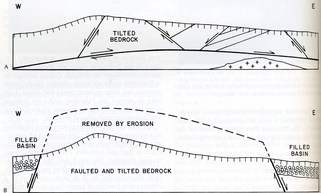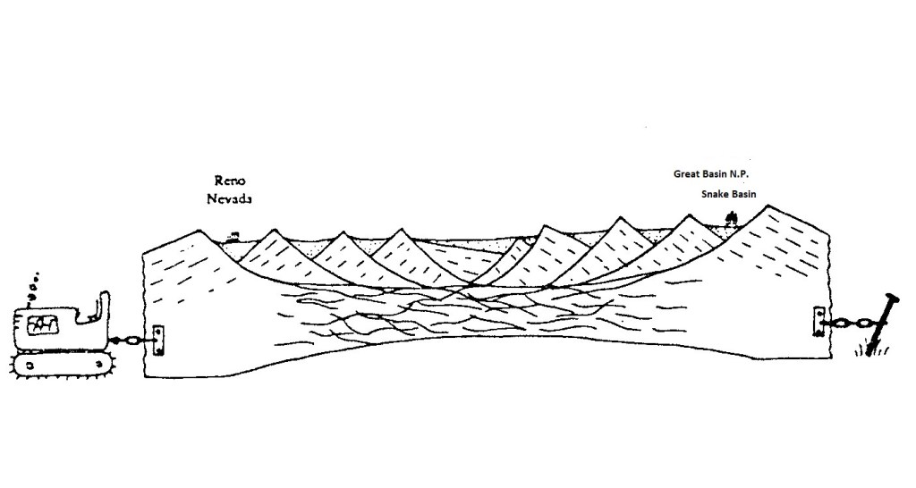 Imaged above, The modern basins and ranges began to appear only within the last 30 million years or so, during the Cenozoic Era, when the Earth’s crust in this area began to stretch in an east-west direction. Bedrock nearest the surface reacted to the crustal stretching by breaking into immense blocks several kilometers wide, tens of kilometers long, and thousands of meters thick. Many of these blocks fractured and the pieces tilted and spread out like a row of odd-sized books sliding out of place on a shelf. The remnants of these broken blocks lie beneath the sediment in the basins. Other blocks remained relatively intact and now form the mountain ranges. Because stretching is in an east-west direction, these ranges line up in a north-south direction.