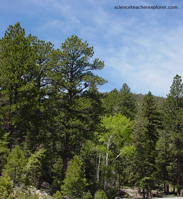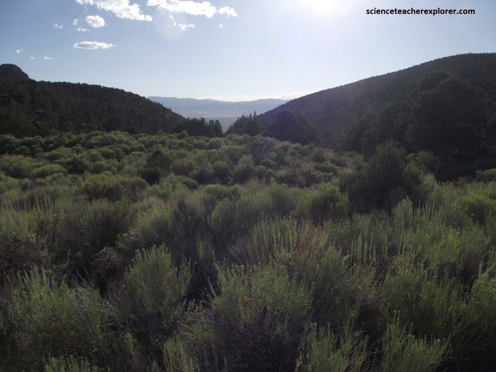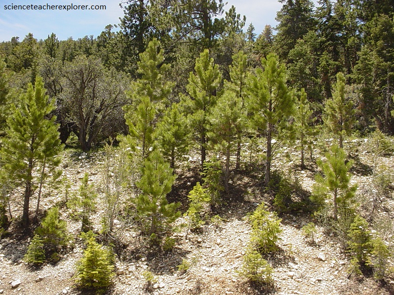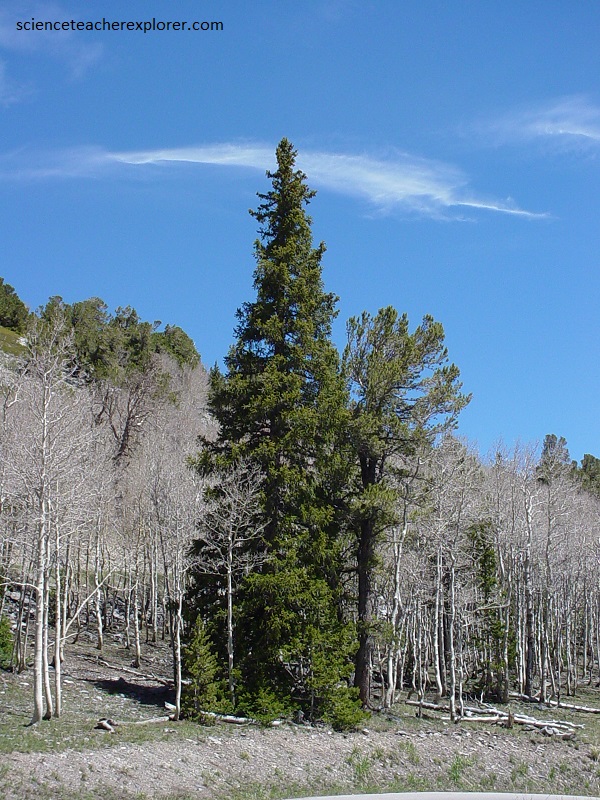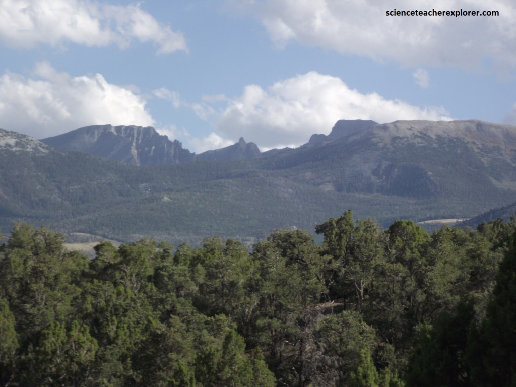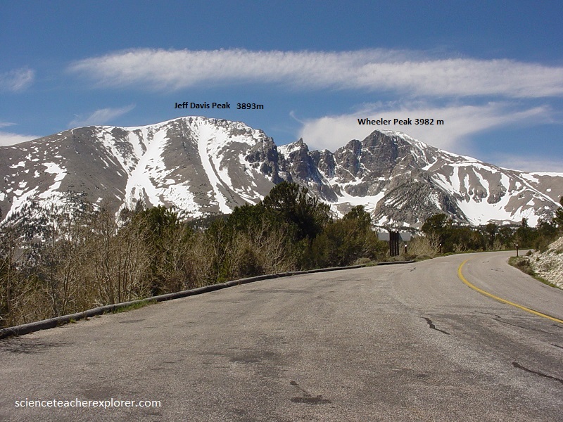 Imaged above, as an educational group, we took our first exploration trip up the paved road to the Wheeler Peak trailhead. The road gains 1,133 m in elevation over 19.3 km. Geologic processes create elevation; elevation, in turn, strongly controls temperature and precipitation. As we increase in elevation, air pressure decreases (air molecules move apart), the temperature drops. The temperature changes about 10 degrees Fahrenheit per mile, (1.61 km) change in elevation. As air rises over a mountain range, (usually from the west), it cools, thus losing much of its ability to hold moisture. The moisture falls to the earth as rain or snow. The air then sinks into the adjoining desert valley and warms, once again able to hold large amounts of moisture. [The Snake and Spring Valleys average about 10 cm of precipitation/year, but the higher peaks of the Snake Range receive more than 76 cm of precipitation/year].