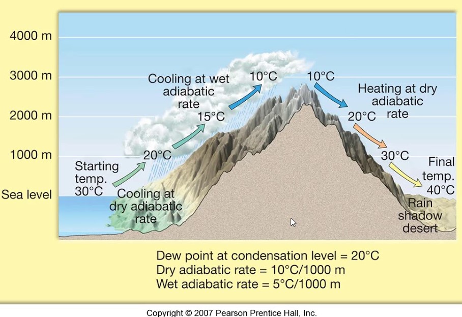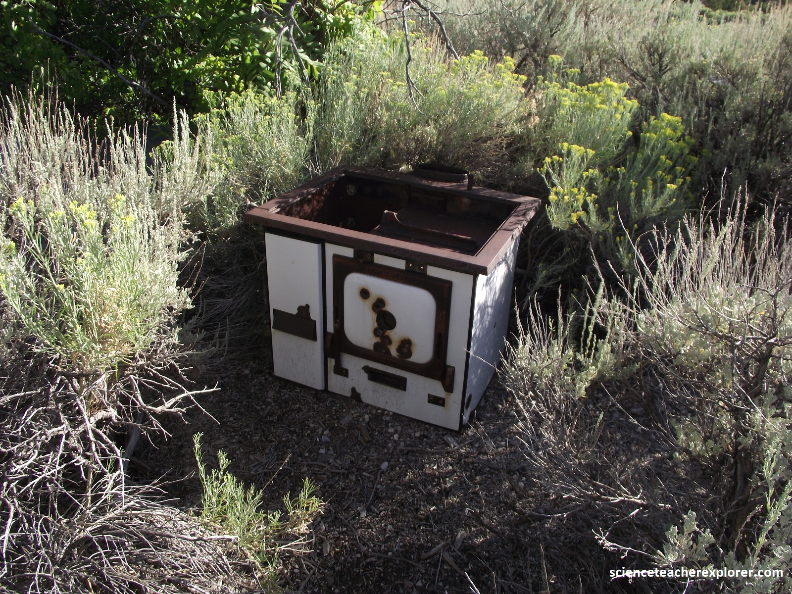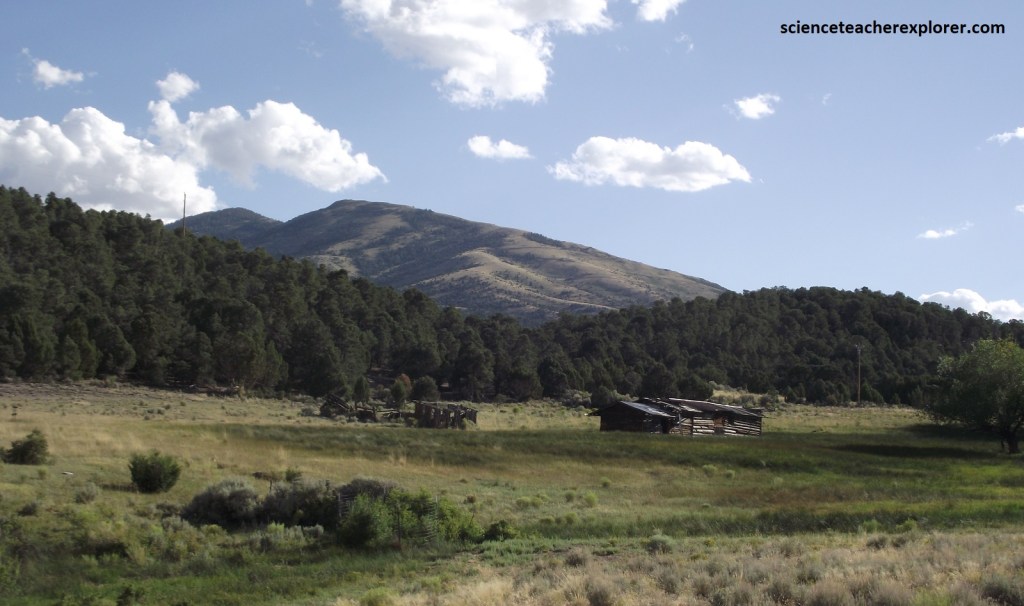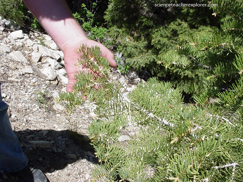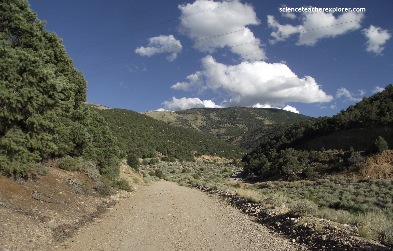Imaged above, as an educational group, we took our first exploration trip up the paved road to the Wheeler Peak trailhead. The road gains 1,133 m in elevation over 19.3 km. Geologic processes create elevation; elevation, in turn, strongly controls temperature and precipitation. As we increase in elevation, air pressure decreases (air molecules move apart), the temperature drops. The temperature changes about 10 degrees Fahrenheit per mile, (1.61 km) change in elevation. As air rises over a mountain range, (usually from the west), it cools, thus losing much of its ability to hold moisture. The moisture falls to the earth as rain or snow. The air then sinks into the adjoining desert valley and warms, once again able to hold large amounts of moisture. [The Snake and Spring Valleys average about 10 cm of precipitation/year, but the higher peaks of the Snake Range receive more than 76 cm of precipitation/year].