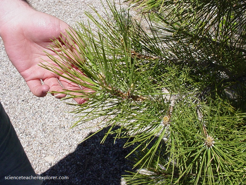 Pictured above, the Ponderosa Pine needles are about five inches (13cm) long, thick and flexible, they come two to a bundle. Cones are 3 to 6 inches (8-15cm) long and reddish to yellowish. They produce a mottled purple winged seed.