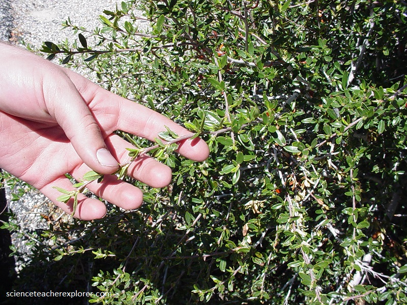 Pictured above, Cercocarpus ledifolius is a drought resistant tree common on dry hillsides and ridges between 6,000 and 9,000 feet (2,000-3,000m) elevation. It is a small tree with a tendency to be round crowned and sprawling. The bark is red brown and thick with a rough scaly surface. Wood is reddish, resembling true the mahoganies of the tropics. The leaves are evergreen, thick and leathery with curled under margins. They are dark green above and light green underneath. The foliage is a favorite food of deer as it is green year round. Yellow flowers produce hairy seeds in the fall. Each seed is tipped with a 2 to 3 inch (5-8cm) tail-like style. These tails twist hygroscopically, in moist weather where they are straight, but in dry weather they curl like a corkscrew. This twisting bores the seed down into the soil, anchoring it and increasing the chance of germination.