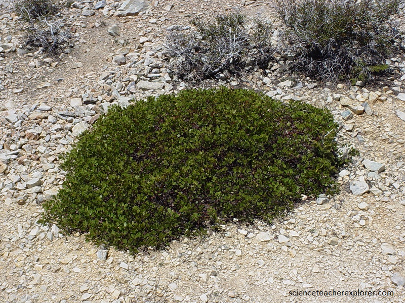 Pictured above, Arctostaphylos patula inhabits dry sunny sites in the open forests below 9,500 feet (3,200m) elevation. It prefers cooler areas than sagebrush. The crooked, ridged stems have a thin, shiny, smooth bark that peels and is dark red to chocolate in color. Bright, round, alternate, evergreen leaves have entire margins. Leaf orientation varies depending on the amount of light and heat. Shrubs in shady areas have horizontal leaves to catch all available light; ones in sunny areas have vertical leaves to reduce water loss.