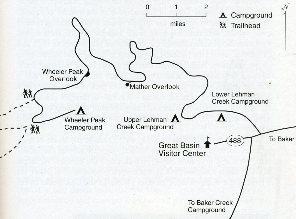 From Salt Lake City, Utah, we traveled south on Interstate 15, we then traveled 266 km west on U.S. 6, which joins with U.S. 50 at Delta, Utah. We then turned south on Nevada 487 and drove 8 km into Baker, Nevada before we headed west on Nevada 488 and drove 9.7 km to the park.