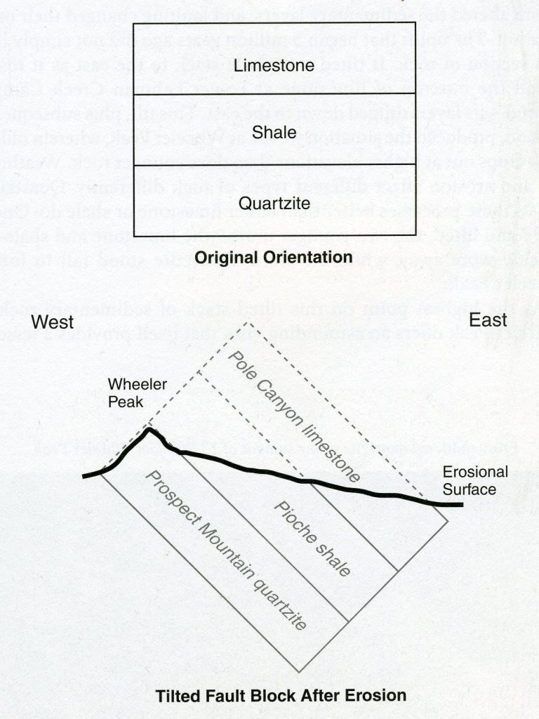 Imaged above, block faulting 5 million years ago, (the same faulting that produced Nevada’s alternating mountains and valleys), brought the Prospect Mountain quartzite and other metamorphic rocks to the surface throughout the southwestern United States. These faults bound the Snake Range of the Great Basin National Park on the east and west.