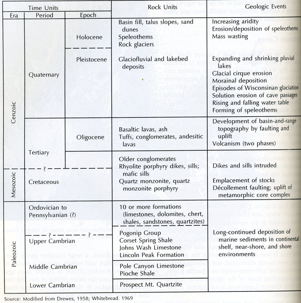 Great Basin National Park encompasses most of the South Snake Range. The bulk of the rocks exposed in this range are formed of sediments like sand, mud, and calcium carbonate. These sediments were deposited at the bottom of a shallow sea during the late Precambrian age and Cambrian period (around 560 million years ago). As layers accumulated upon layers, those sediments were turned into sedimentary rock. Sand became sandstone, mud became shale, and calcium carbonate became limestone. [Pole Canyon Limestone chemically precipitated out of the seawater & forms Lehman’s Cave].