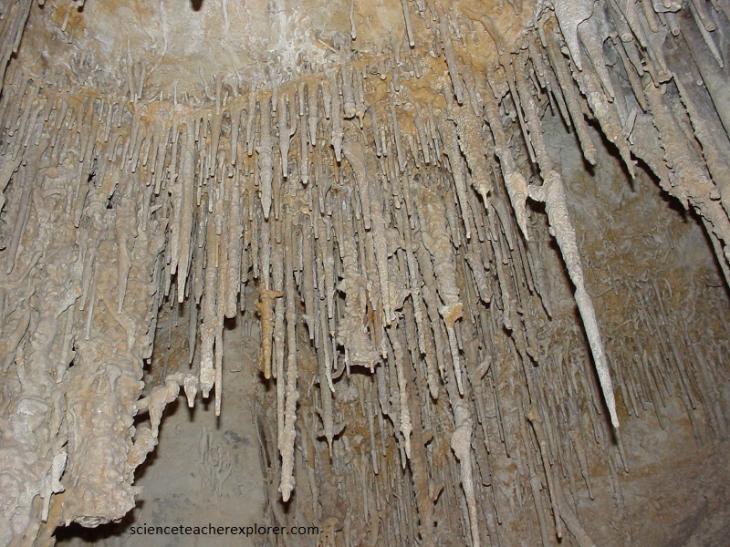 Drop after drop, ring after ring, the deposits eventually produce a hollow tube which hangs from the ceiling like a soda straw. Straw stalactites my grow to a length of a meter or more, (pictured above).