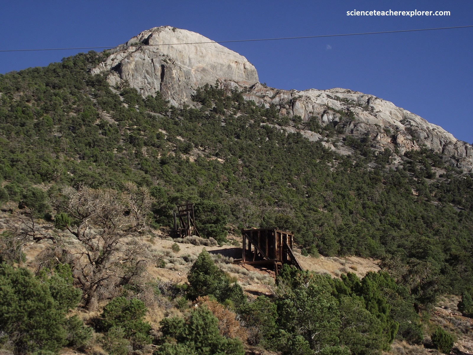 Imaged above, the Prospect Mountain quartzite, composed almost purely of quartz, strongly resists weathering, (the chemical and physical alteration of rock at the earth’s surface). In an undisturbed sequence of sedimentary rock, the oldest rock lies at the bottom of the stack and the layers get progressively younger above it. However, in this case, as we climb to higher elevations, we find the youngest rock, (Pole Canyon limestone), at the lowest elevations and the oldest rock, (Prospect Mountain quartzite), at the highest elevation. This is because the uplift that began 5 million years ago did not simply lift this section of rock. It tilted the whole stack to the east as it rose. Once tilted and lifted, the two younger units, (the Pole Canyon limestone and Pioche shale), quickly wore away, while the sturdy quartzite stood tall to form Wheeler Peak.