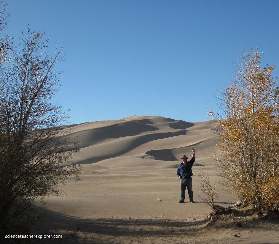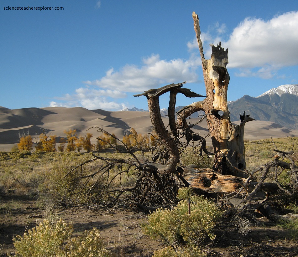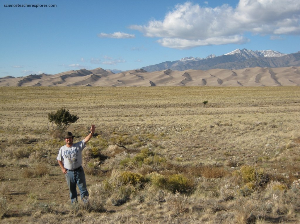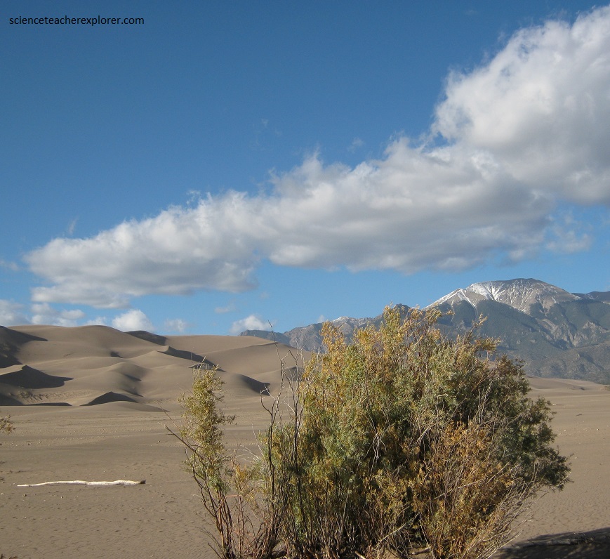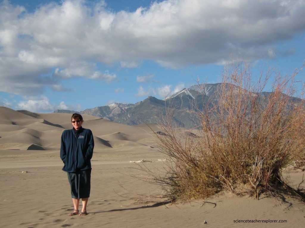 About 12,000 years ago, a warming climate melted the Pleistocene glaciers, creating rivers and streams. This carried large quantities of silt, gravel, and sand into the San Luis Valley. Prevailing winds from the southwest, carried sand to the eastern edge of the valley. Pictured above behind Becky, the Sangre de Cristo Mountains on the eastern side acted as a barrier, forcing the winds to lose energy and release their clutch of the sand. As a result, the dunes were gradually enlarged by the wind.