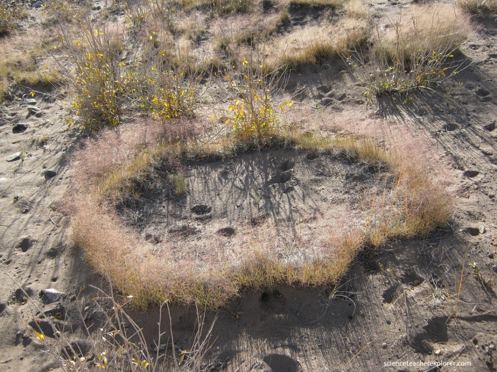 The picture above shows the famous “Ring Muhly”. It is a grass that grows in a circle. This grass grows outward, releasing a chemical inside the circle that prevents other grass from growing there. In this way, a “bucket” is formed that captures rainfall in the desert climate.