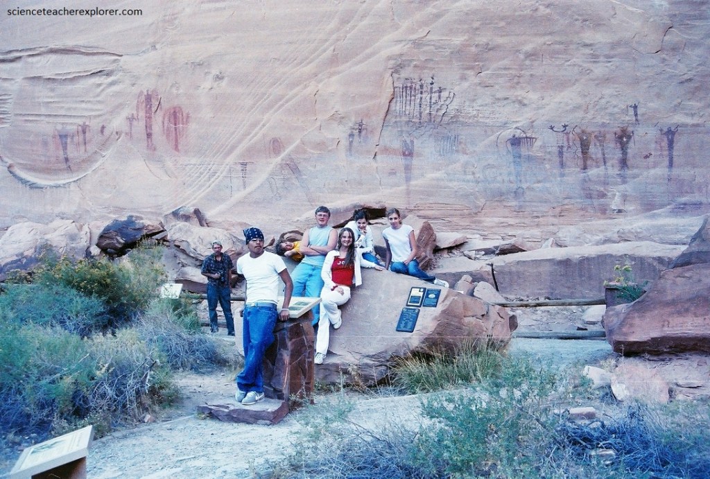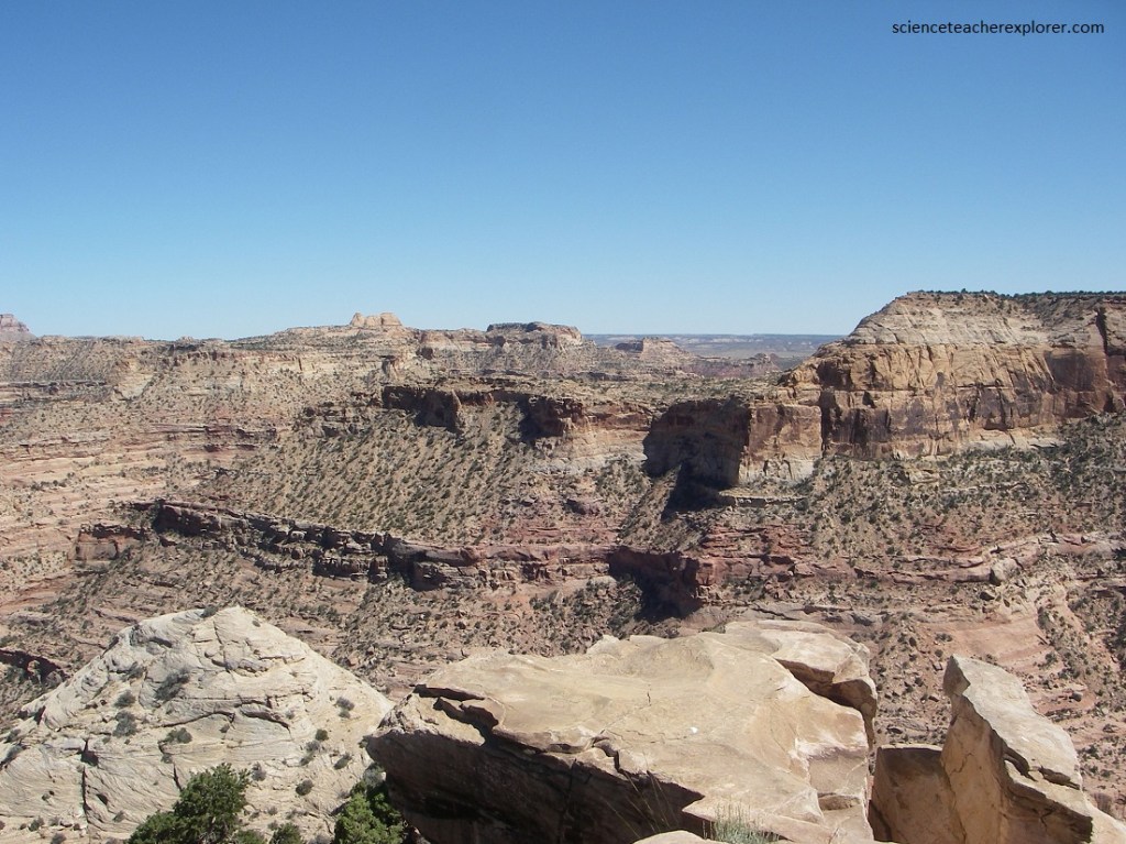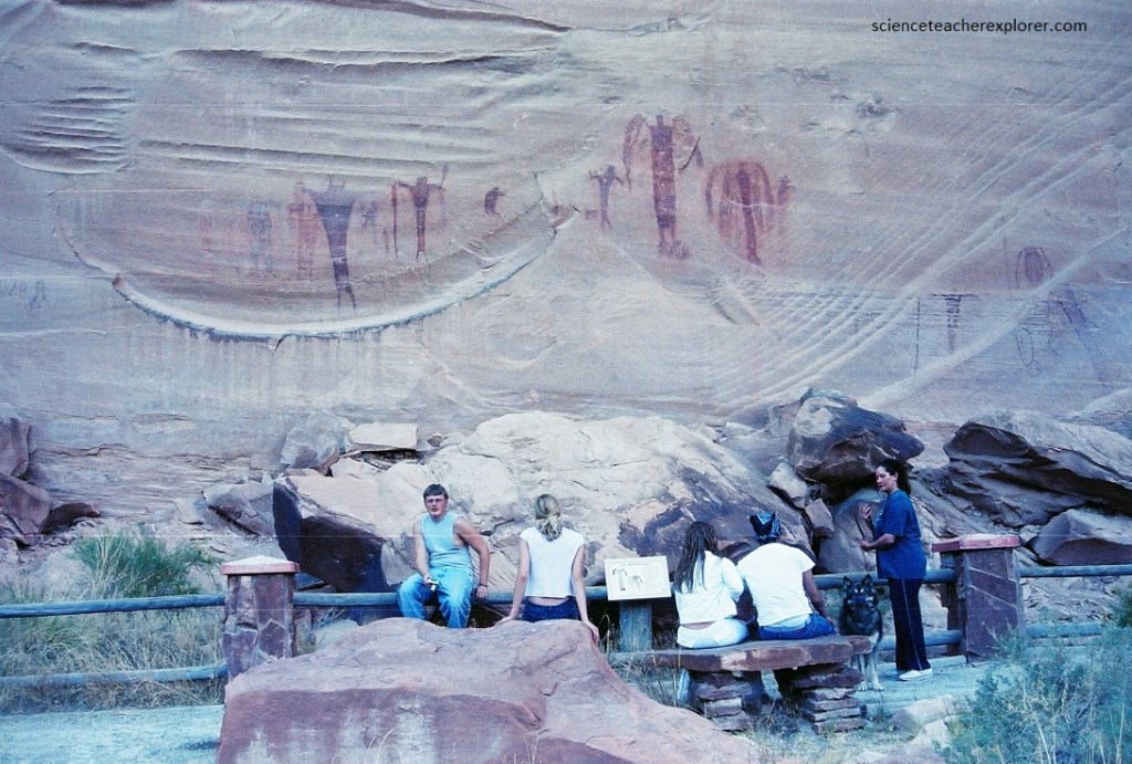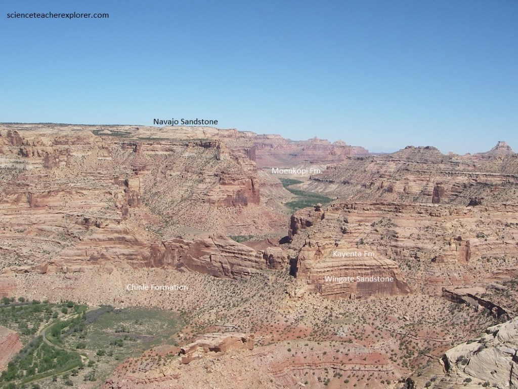 As we entered the Swell from the southeast, we followed geologic history back in time. From youngest to oldest, the strata include mostly sandstones of the Carmel Formation, Navajo Sandstone, Kayenta Formation, Wingate Sandstone, Chinle Formation, and Moenkopi Formation, which were formed in a variety of depositional environments (rivers, deserts, and shallow seas).