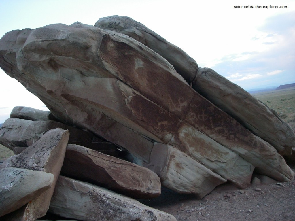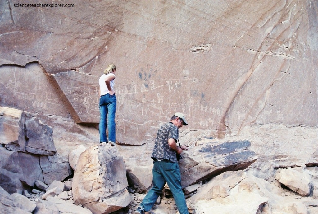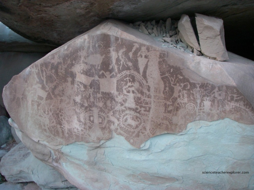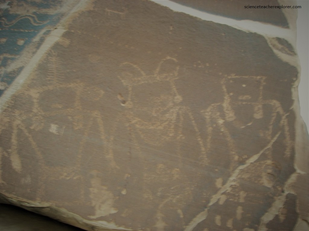 Pictured above, the “45 Degree Rock” petroglyphs were on a patinated surface of the inclined boulder, including several humpbacked figures, bighorn sheep, a large snake, and other motifs.