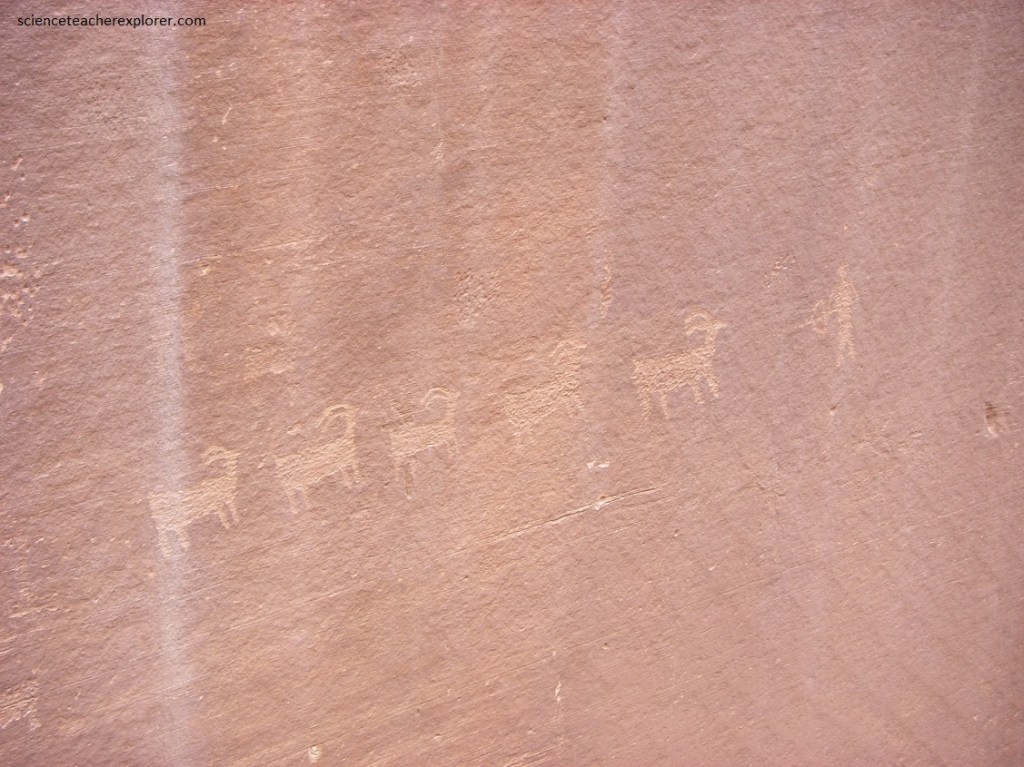 Pictured above, about 4 kilometers below the Buckhorn Wash Road and the Green River Cutoff Road junction, is a spectacular rock-art site. This panel, situated in a large rock shelter on the north side of the canyon, is partially obscured from view by a large sand dune. The petroglyphs, which cover an area about 25 meters in length, consist of stick-figure humans, some of which are holding hands and some in pairs, along with animals (mostly bighorn sheep) and abstract motifs. The stylistic affinities of these petroglyphs are uncertain, but they probably post date the Barrier Canyon Style pictographs found down the canyon. They may be related to the Northern San Rafael Fremont.
