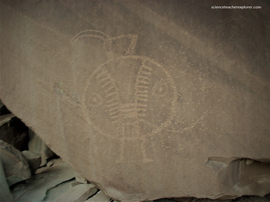Pictured above, the other rock art at this site, located straight ahead (north) as we drove in, consists of a prominent, one meter high shield figure on the flat face of a large boulder, about 6.7 meters up. The Fremont anthropomorph is the “Silent Sentinel” for which the site is named.
