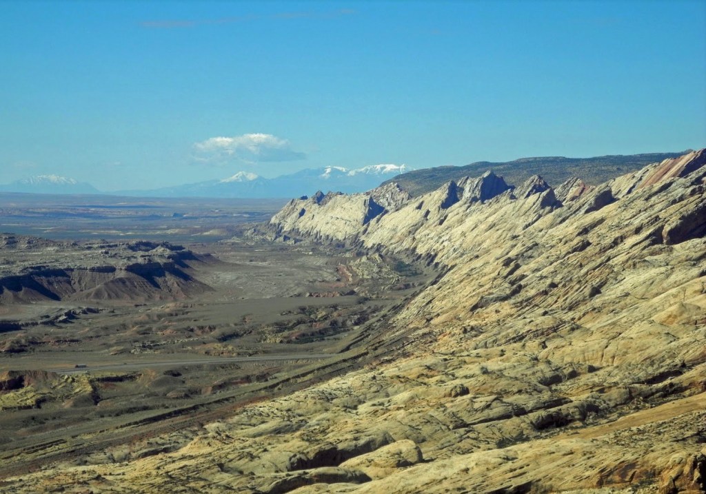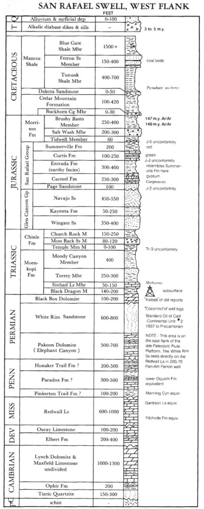 The San Rafael Swell has been described as a “land of naked rocks” because the sedimentary strata are so colorfully and well exposed. Imaged above, colorful sedimentary rocks, ranging in age from Permian to Cretaceous, are exposed across the San Rafael Swell. Additionally, Tertiary igneous dikes and sills cut the sedimentary rocks, mostly in the southwest corner of the Swell area. Unconsolidated Quaternary deposits, the weathered and eroded products derived mostly from the sedimentary strata of the area, are ubiquitous in the Swell, especially at the base of slopes and cliffs and along the more active stream courses.