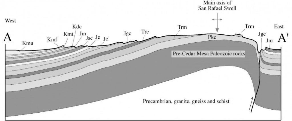 As mentioned above, the Swell is an uplifted area where sedimentary rock layers were arched skyward into an elongate dome-like structure (called an anticline). The upwarp resulted from compressional forces in the Earth’s crust about 40–70 million years ago. Millions of years later, erosion began in force, eventually removing thousands of feet of rock from the Swell’s crest, exposing older rocks (about 300 million years old) in the middle region of the Swell surrounded by a ring of younger rocks (ranging in age from 100 to 230 million years old).