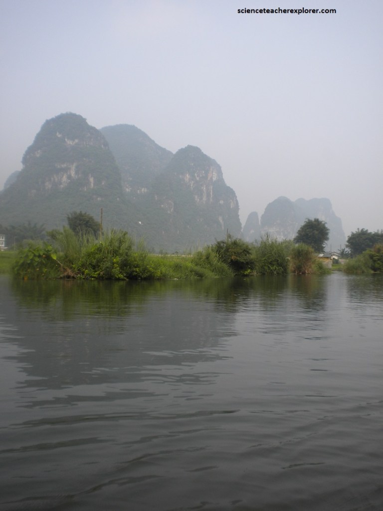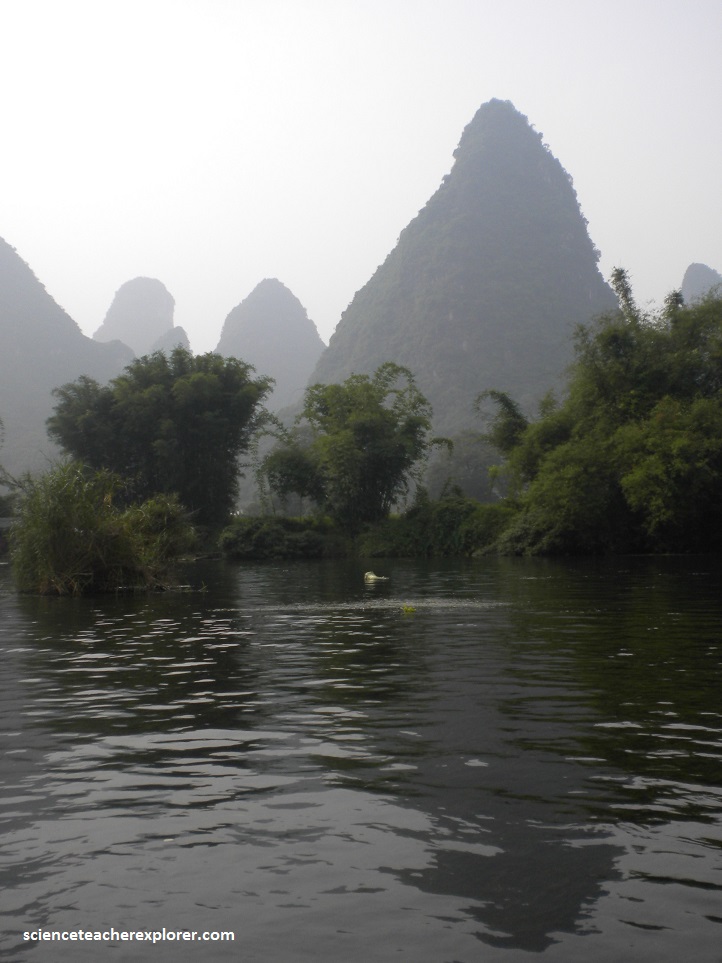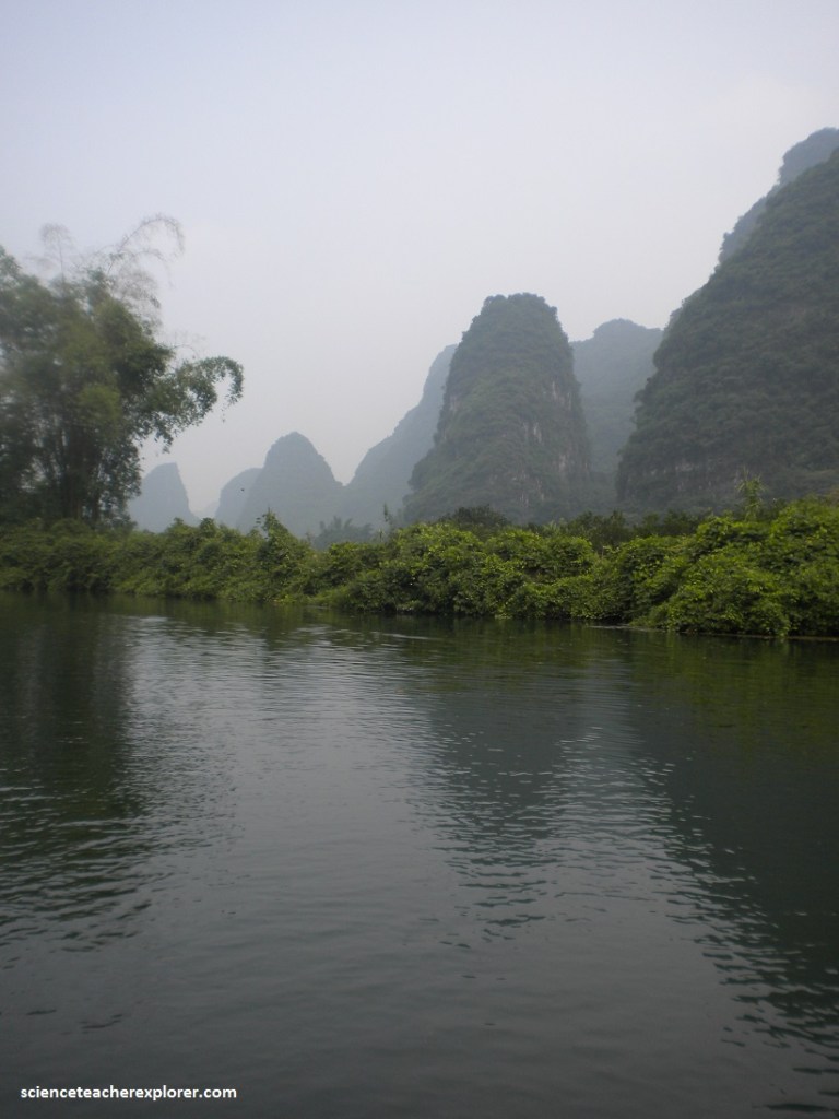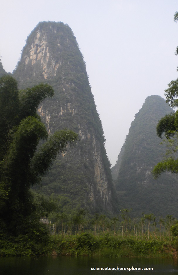 Pictured above and below, there are two types of karst landscapes that predominate on our bamboo-raft trip between Guilin and Yangshuo. Fenglin (peak forest or isolated towers) and fengcong (peak cluster or linked-base towers). The two types may have evolved sequentially from peak forest to peak cluster, or they may have evolved simultaneously.