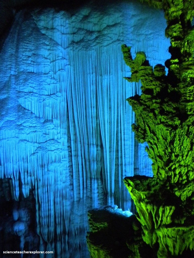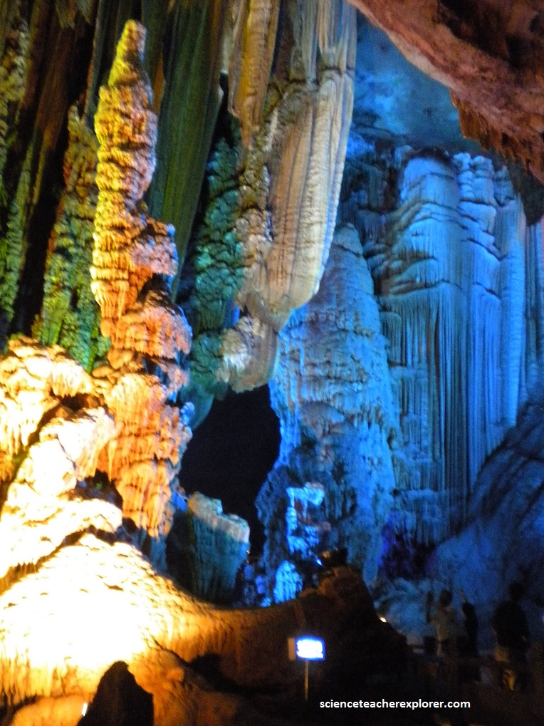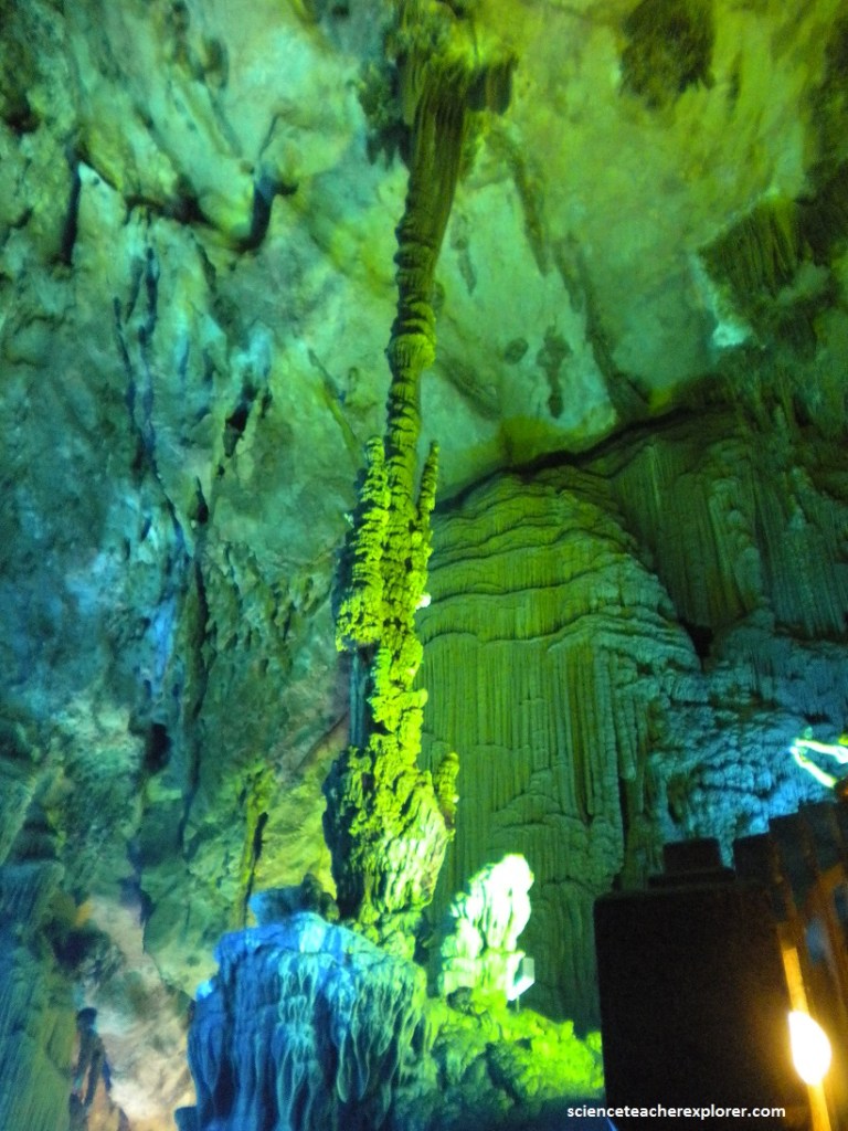 As the limestone karsts above continued to rise and the softer substances were washed away, they became proper caves. The thick subtropical jungle helped feed carbonic acid into the subterranean caves. This carbonic acid (formed by plant matter interacting with water) breaks down rock via slow erosion over millions of years. Phosphates and calcium are separated from rock, broken down in the carbonic acid as it flows lower, and then deposited on new layers of rock. This can be seen as water drips from stalactites to stalagmites. Thus fantastical rock formations can be found in Guilin’s many caverns, particularly Silver Cave.