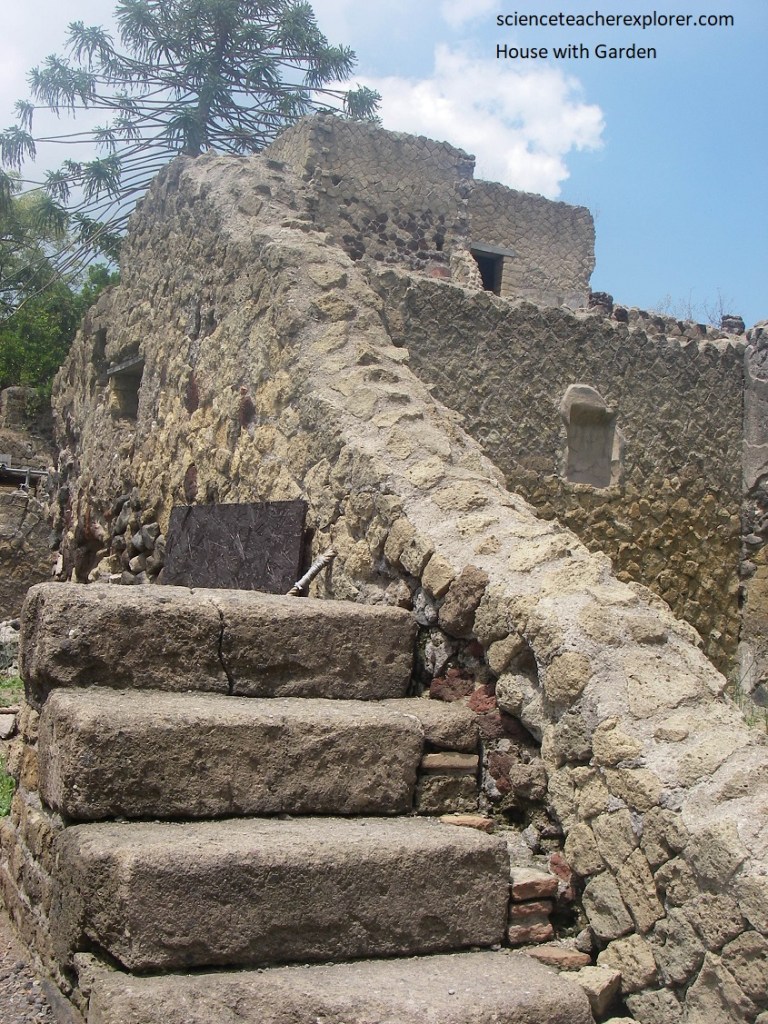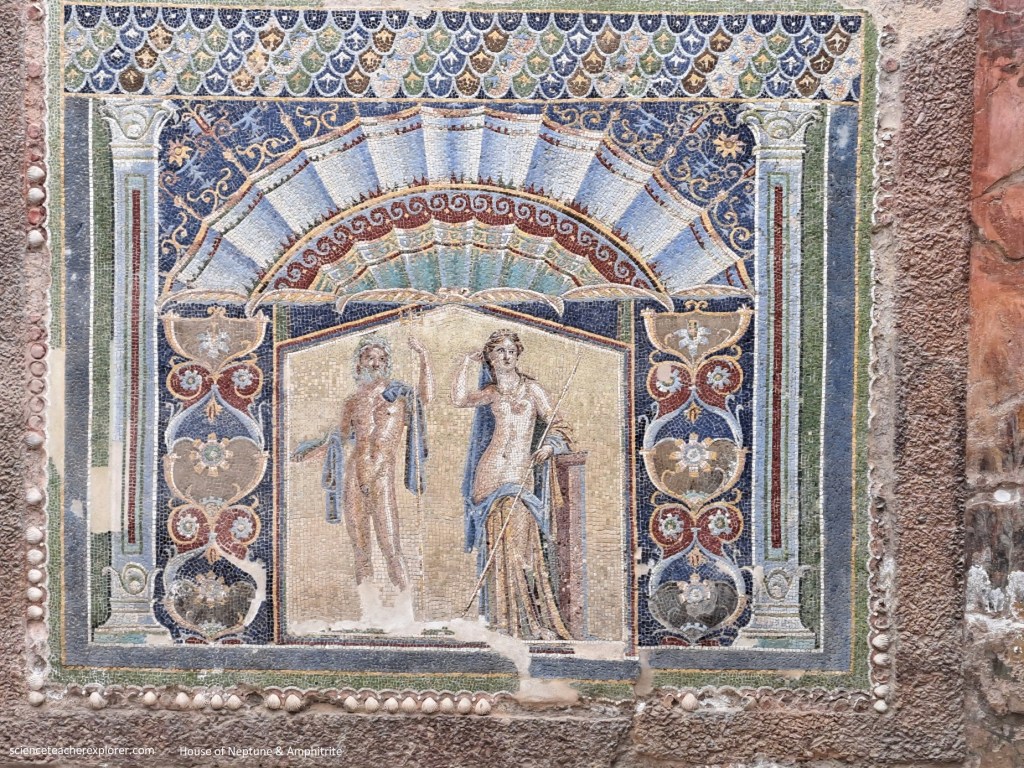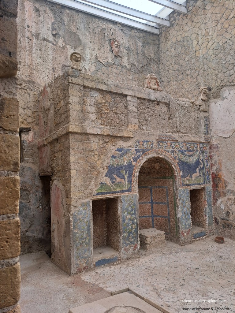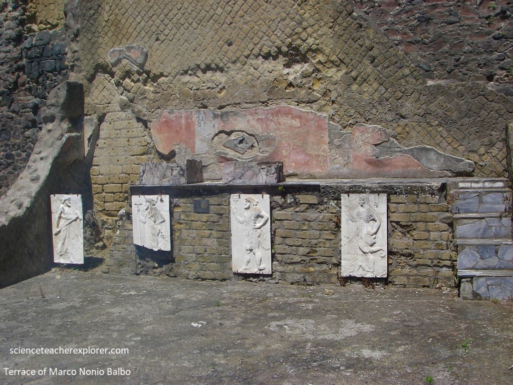 Pictured above, the “Sacred Temple of Venus” was an enclosure with 2 temples, constructed on a terrace symmetrical with that of the palaestra of the Suburban Baths, built up against the escarpment of the town walls, overlooking the ancient coastline. Becky and I entered a rectangular area, with pilastered portico on the north side. In the rubble of earth from the portico and the courtyard, a large number of architectural terra-cottas were found. The older temple had a podium on the back wall that was accessible from a staircase that was faced with antico marble. Set upon the podium were the beautiful archaic marble-reliefs showing us the divinities which were venerated: Minerva, Vulcan, Neptune and Mercury. Here we could clearly see the impressive depth (21m) of the successive volcanic layers deposited by the eruption of 79AD.