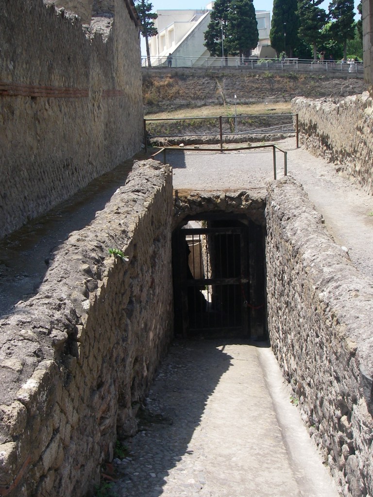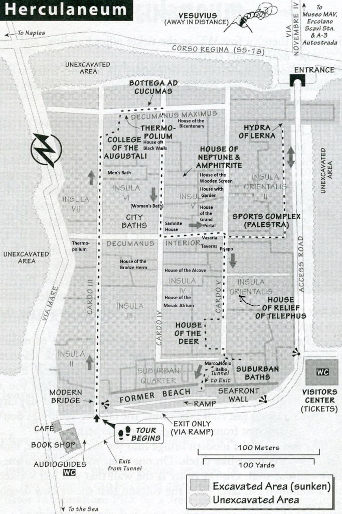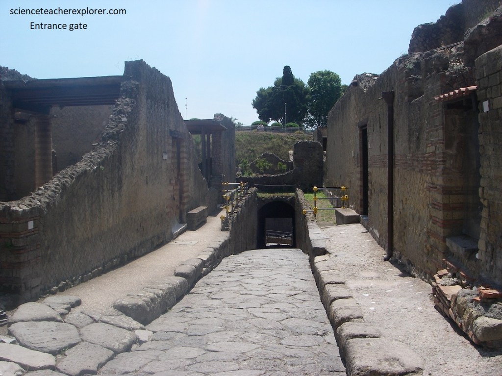 Imaged above, Herculanium is laid out in the typical Roman grid pattern, with intersecting streets known as “Decumani” and “Cardi”. All the major sites seemed to line-up along the two central Cardi IV and V, which made for a pleasant loop walk. After leaving the ticket building, Becky and I went through the turnstiles and walked the path below the site to the entrance, (pictured below).
