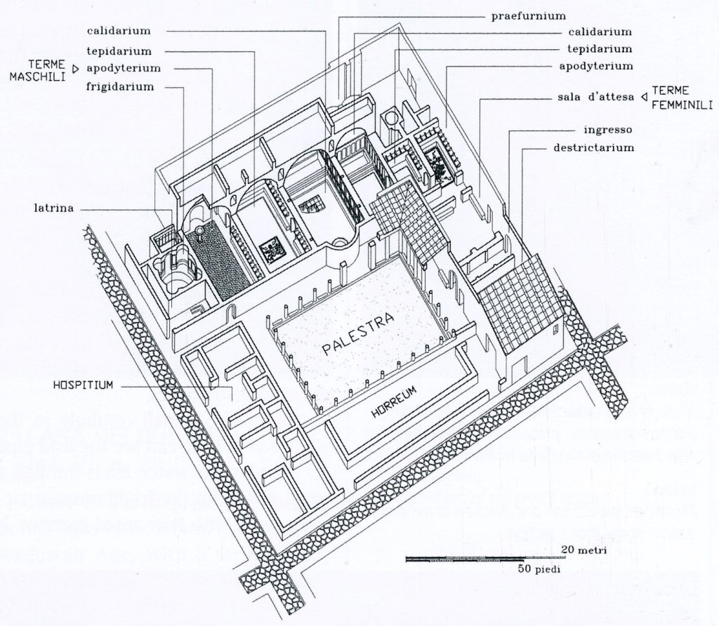 Pictured below, the Men’s-Section apodyterium was a spacious rectangular vaulted room, with a pavement of colored stones sunken into a bed of lime (known as opus scutulatum). Around the edges were seats made of masonry and stalls in which the garments could be left and , on the end wall, a niche with a fountain in cipollino marble and a basin, originally paved with marble slabs , (mostly gone). Like in the Women’s Section, there were parallel grooves (strigilature) in the ceiling, which served to avoid the formation of drips and the dispersion of heat. Additionally, the center of the wall shared with the tepidarium next door, a conduit porthole through which the hot air was channeled outside.