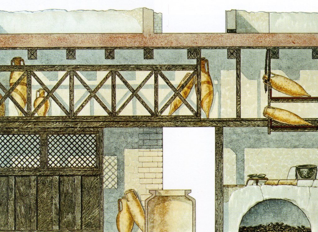 Pictured below, this food-shop was connected by a door to the ‘House of Neptune & Anfitrite’. The cooking hob, the partition, the split-level gallery and the shelves for the amphorae was carbonized wood, are all very well preserved.