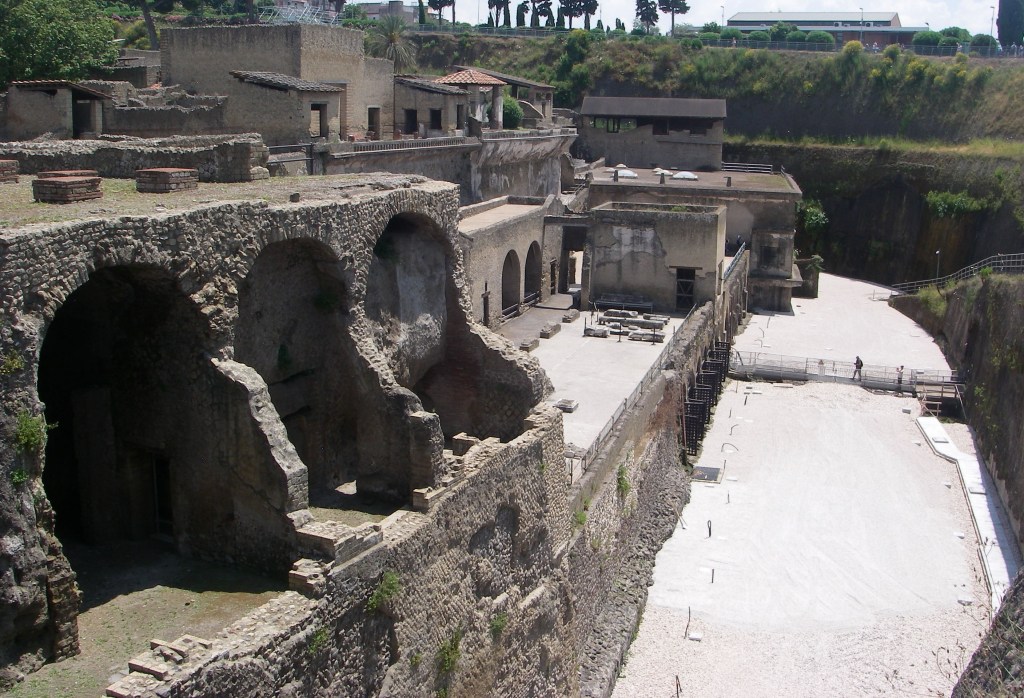 Image above, Herculaneum was destroyed at 1:00 A.M on Aug. 25th, 79 A.D., not by the burning pyroclastic-ash, (like in Pompeii), but by a monstrous avalanche of volcanic debris which rolled down Somma-Vesuvius in the heavy rains that followed the eruption. The site was accidentally discovered by an Austrian well-digger in 1709 under 20 meter of hard volcanic tuff and/or petrified mud, which, having perfectly sealed the town beneath, effectively preserved the wood and household utensils that would otherwise have been lost over time. Systematic excavations didn’t start until the 1920s, and have so far brought to light only half of the town, which might still yield sensational discoveries. {Carbonized human remains were found in the 1990s}.