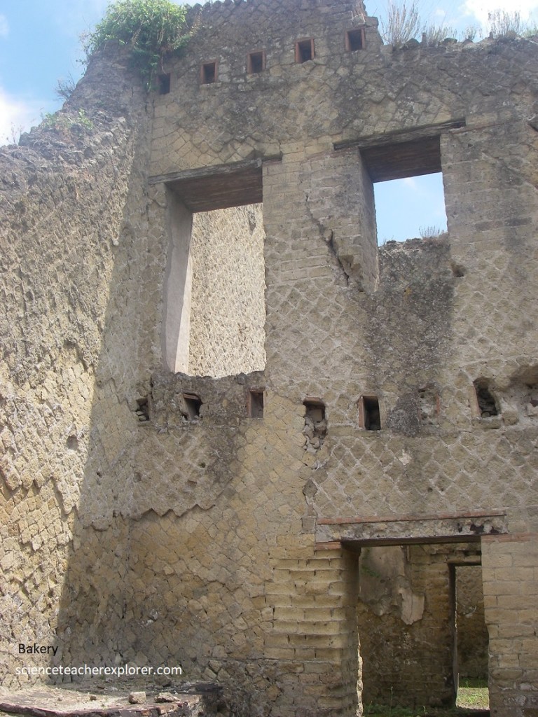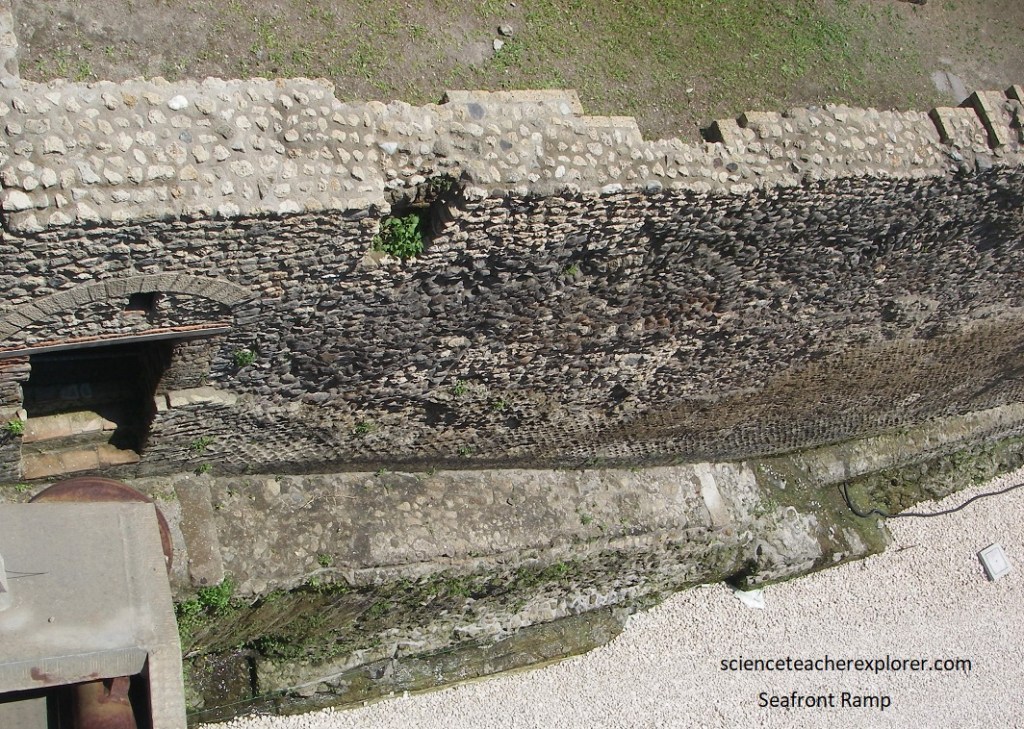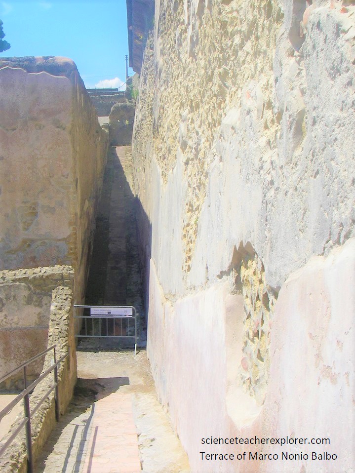 Picture above, as Becky and I crossed the modern bridge into the excavation site, we looked down into the moat-like ditch. On one side, we could see Herculaneum’s sea-front wall. On the other is the wall that we just walked on, a solidified volcanic-tuff layer from the volcano that showed how deeply the town was buried, (pictured below).