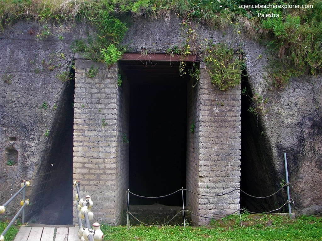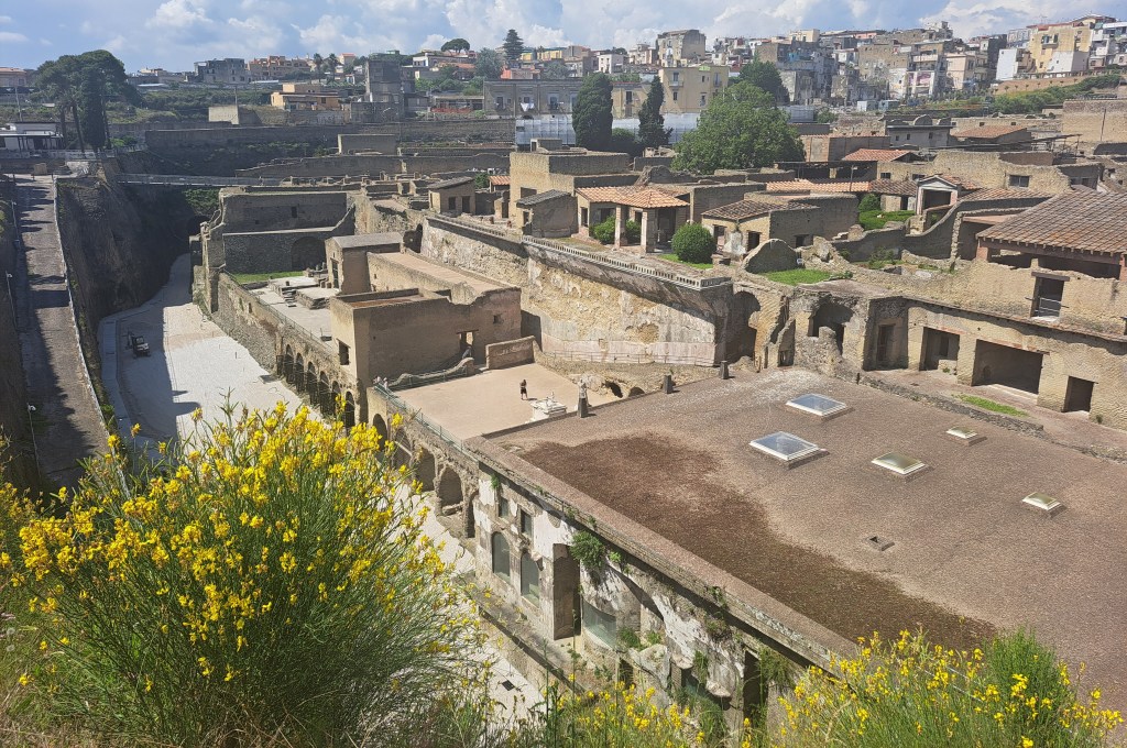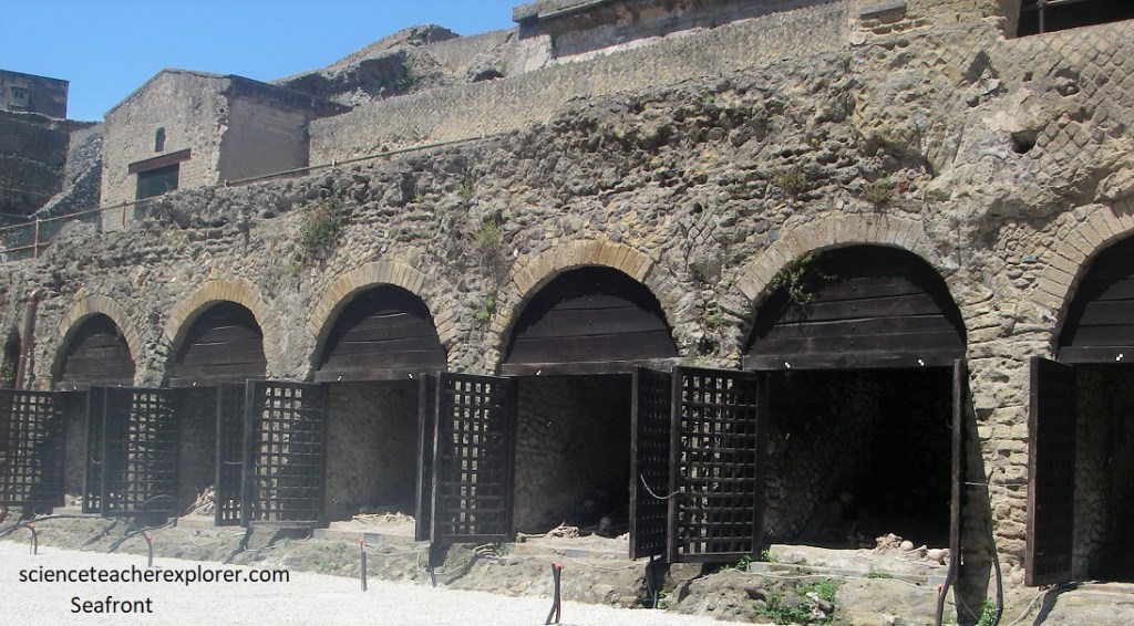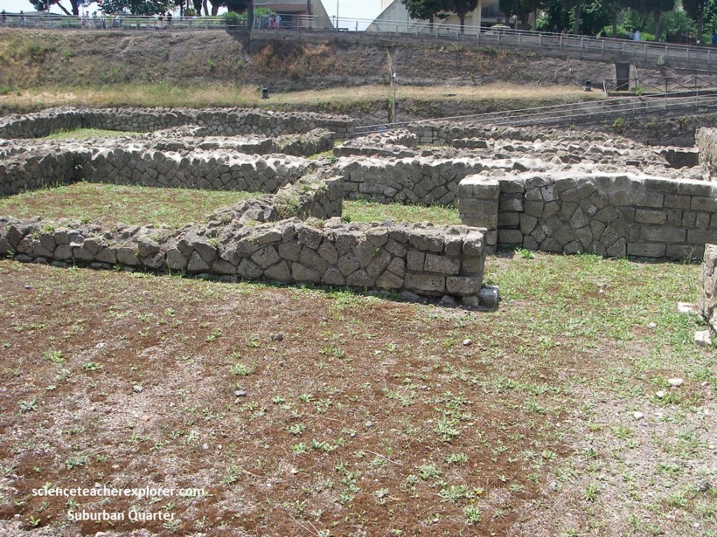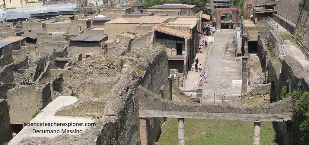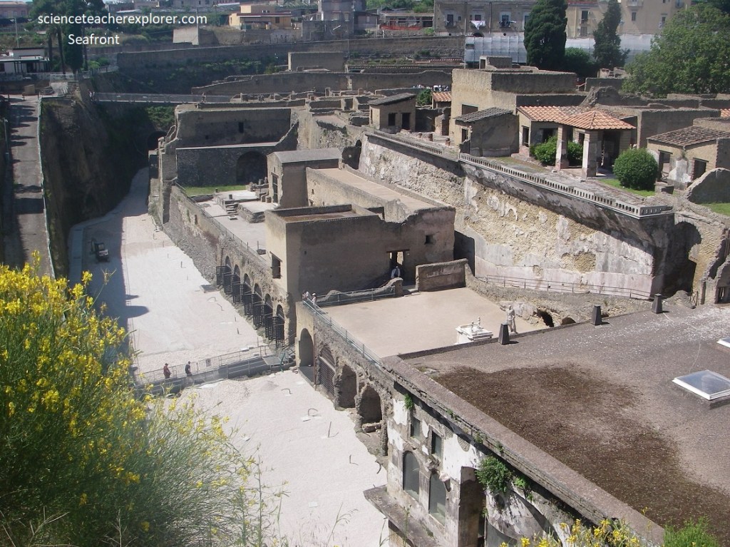 Pictured above, if we looked and noted to our left, seaward, we noted where the shoreline is today. Before the eruption, it was where we were standing , a half a kilometer inland. This gave us a sense of how much volcanic material piled up. The present-day city of Ercolano loomed just above the ruins.