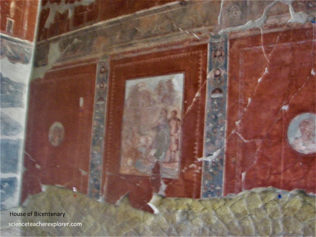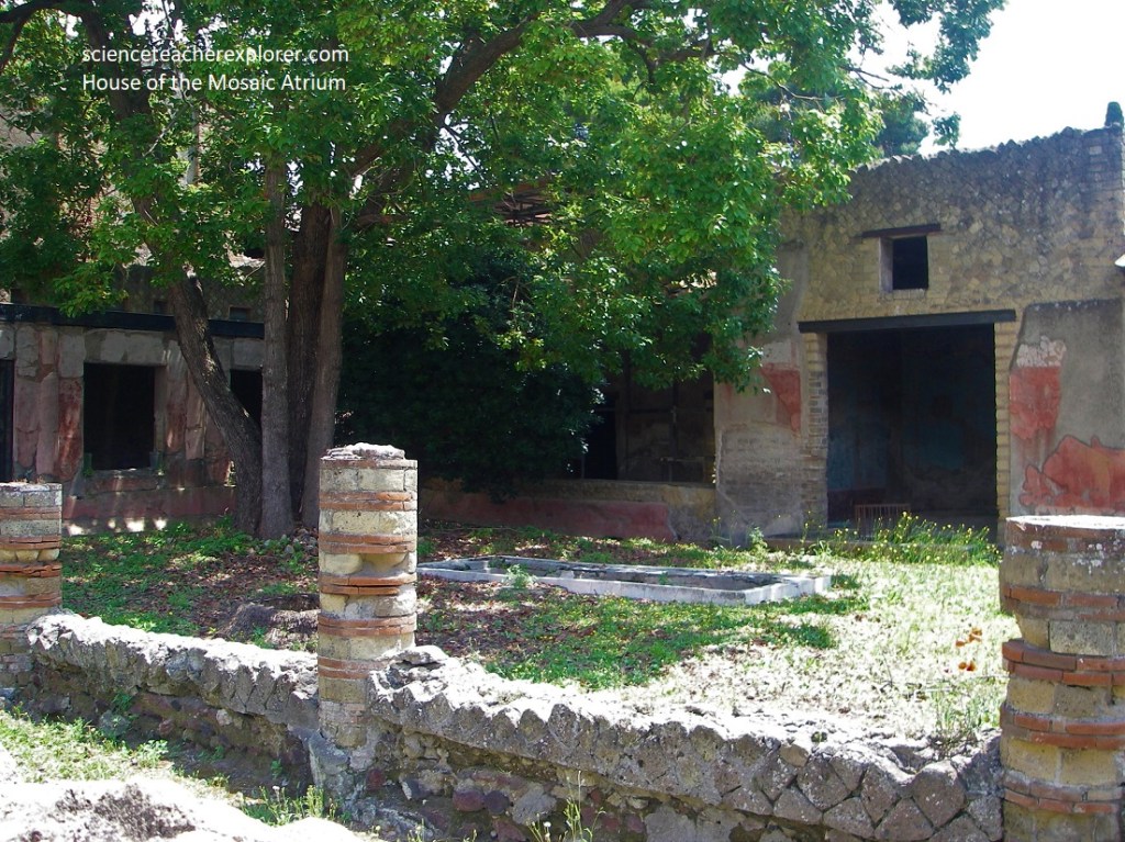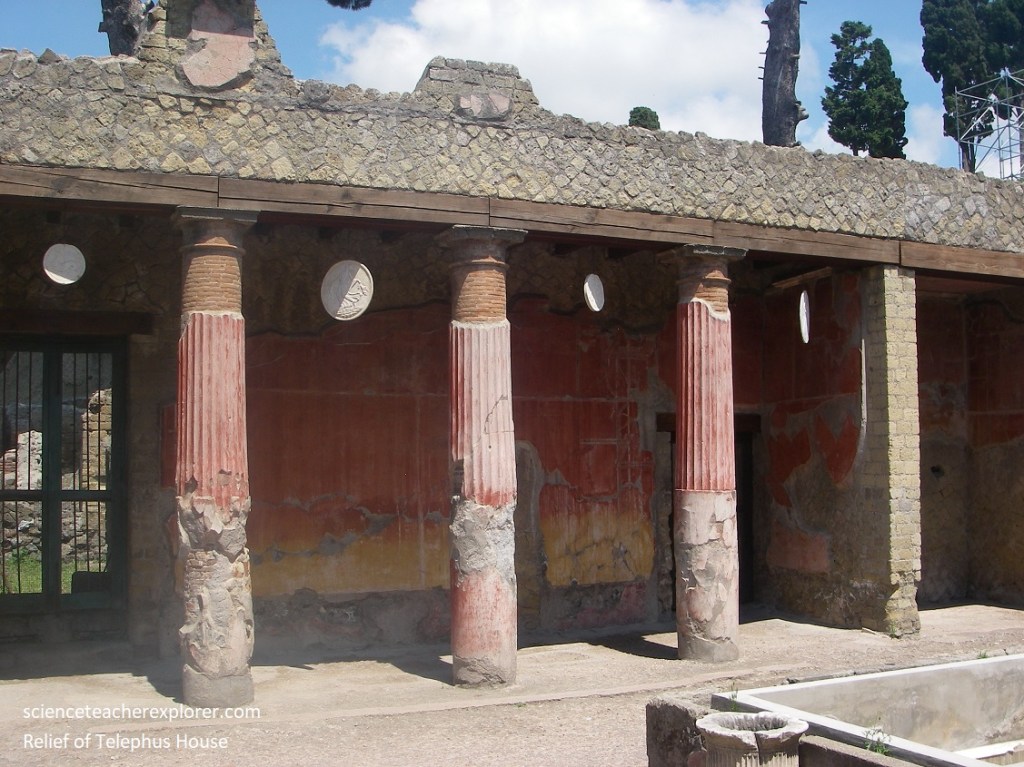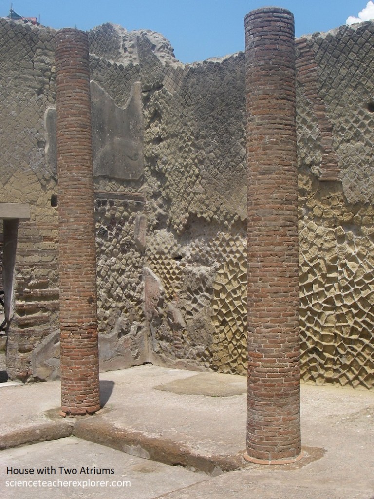 Since the ‘College of the Augustales’ was on the corner, Becky and I strolled down Cardo III for a little ways, to take a brief look at the “House with Two Atriums. Pictured above, one of the atrium areas, with a pavement and impluvium pool faced with cocciopesto, was divided by four tall brick pillars. The walls beared scanty remains of the pictorial decoration made up of large red panels in the central section and a frieze on a white ground featuring architectural motifs.