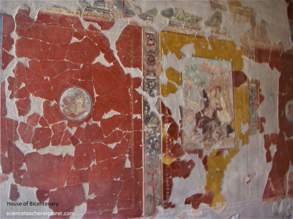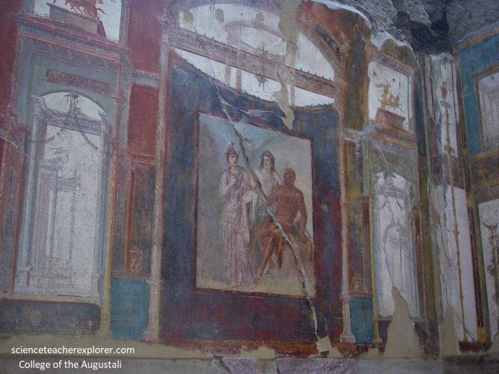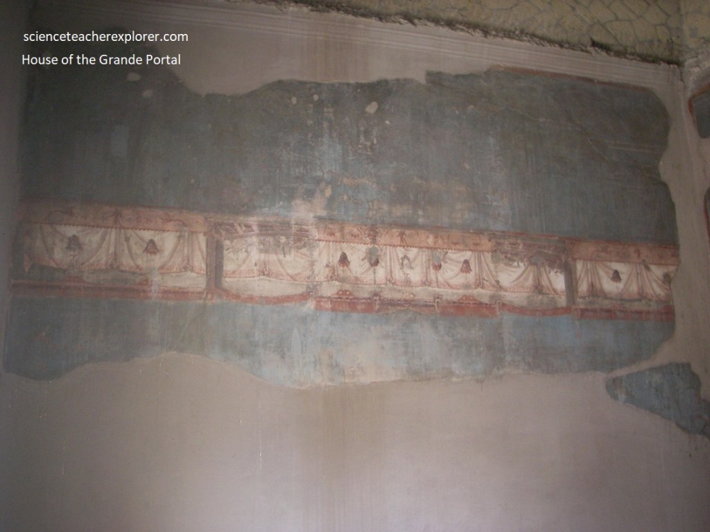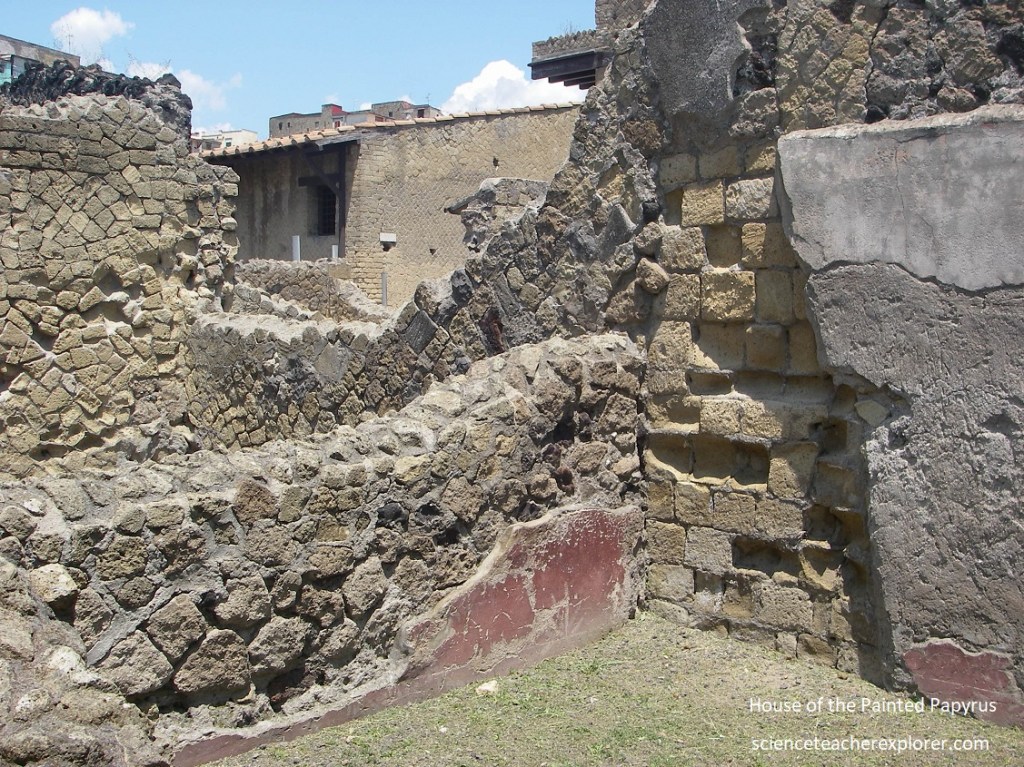 Since the ‘College of the Augustales’ was on the corner, Becky and I strolled down Cardo III for a little ways, to take a brief look at the “House with Two Atriums. Pictured above, one of the atrium areas, with a pavement and impluvium pool faced with cocciopesto, was divided by four tall brick pillars. The walls beared scanty remains of the pictorial decoration made up of large red panels in the central section and a frieze on a white ground featuring architectural motifs.