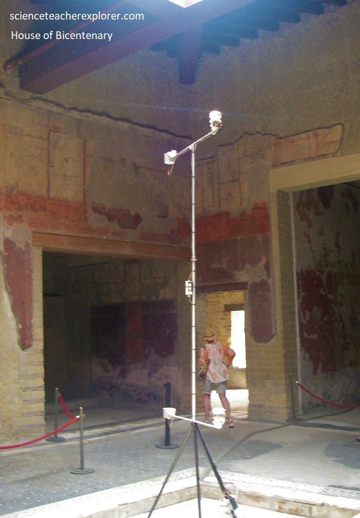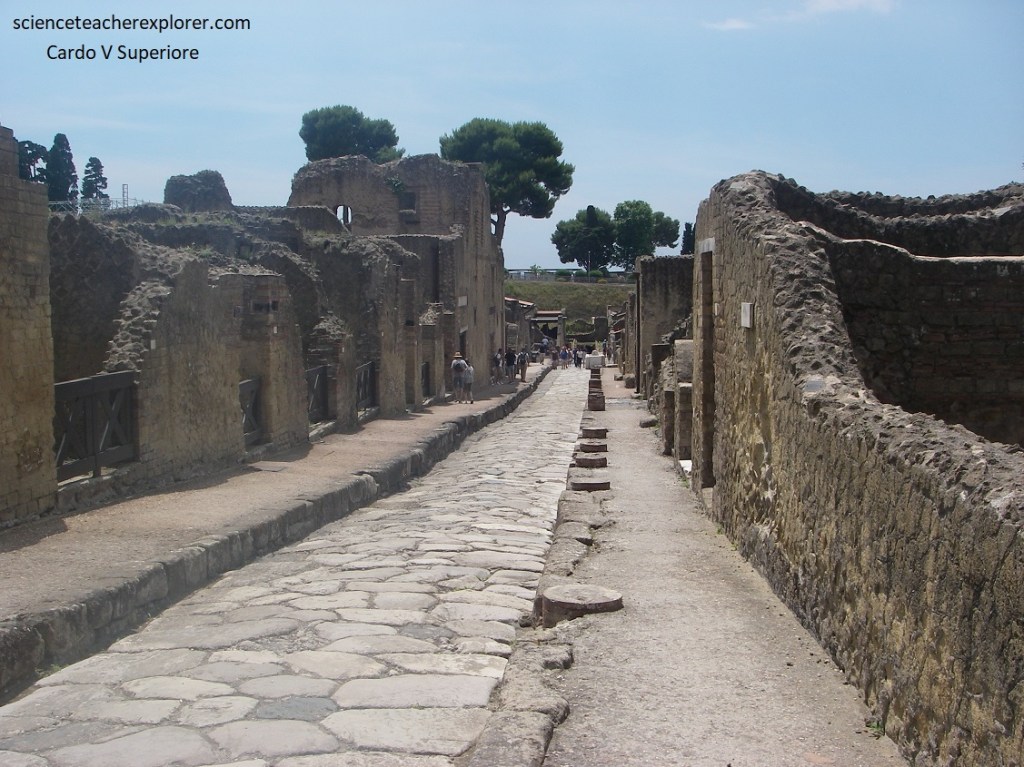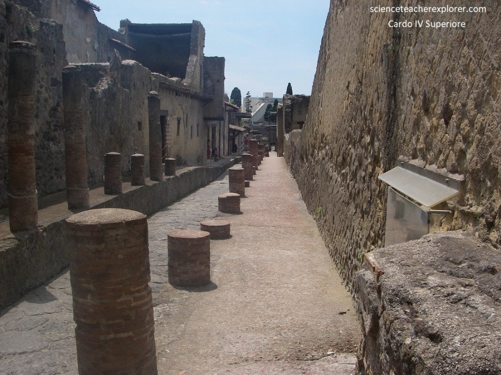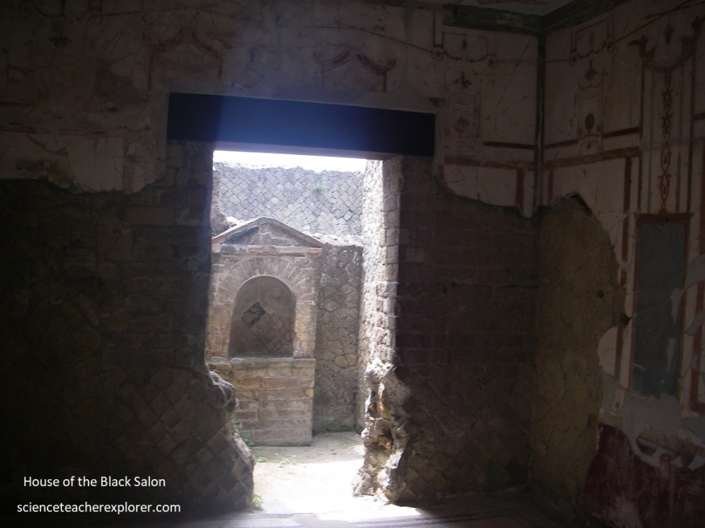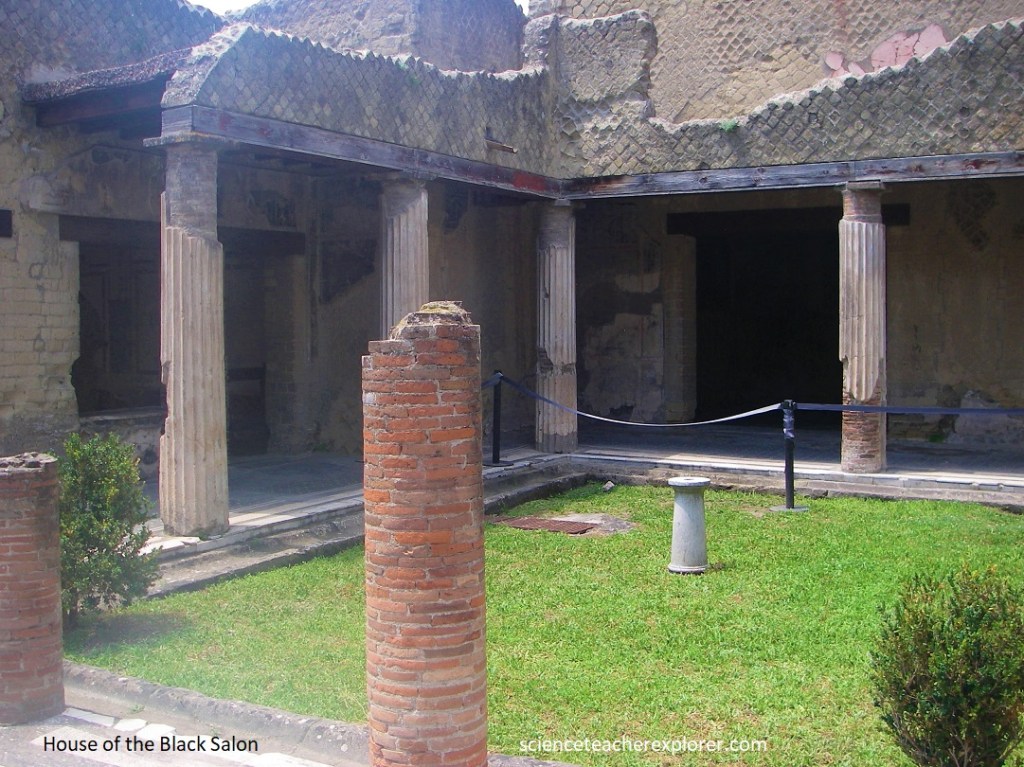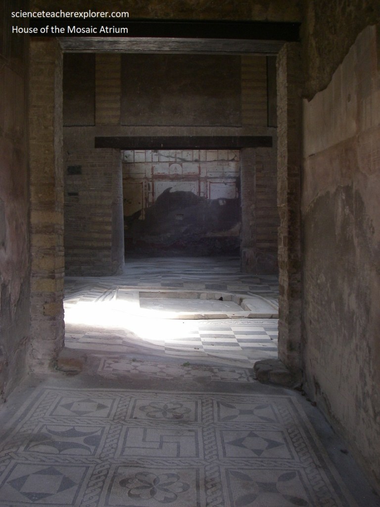 Pictured below, we started our trek from the south-western end of Cardo IV, at the House of the Mosaic Atrium, (Casa dell’Atrio o Mosaico), one of the grandest Herculanean villas whose atrium (the inner courtyard which brought light to the surrounding rooms) still preserves its lovely black-and-white mosaic floor.