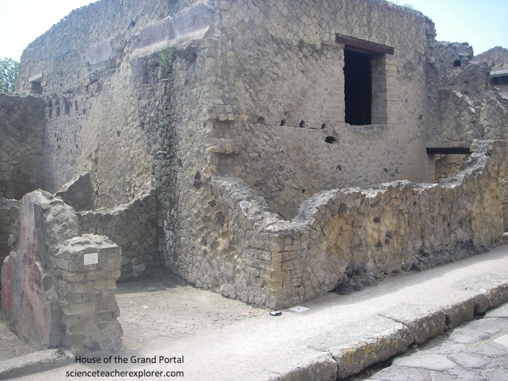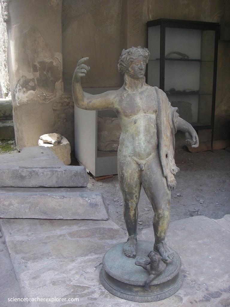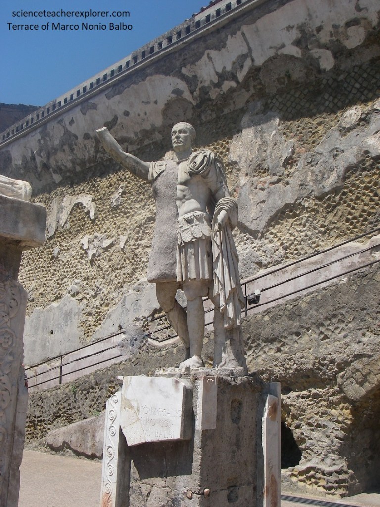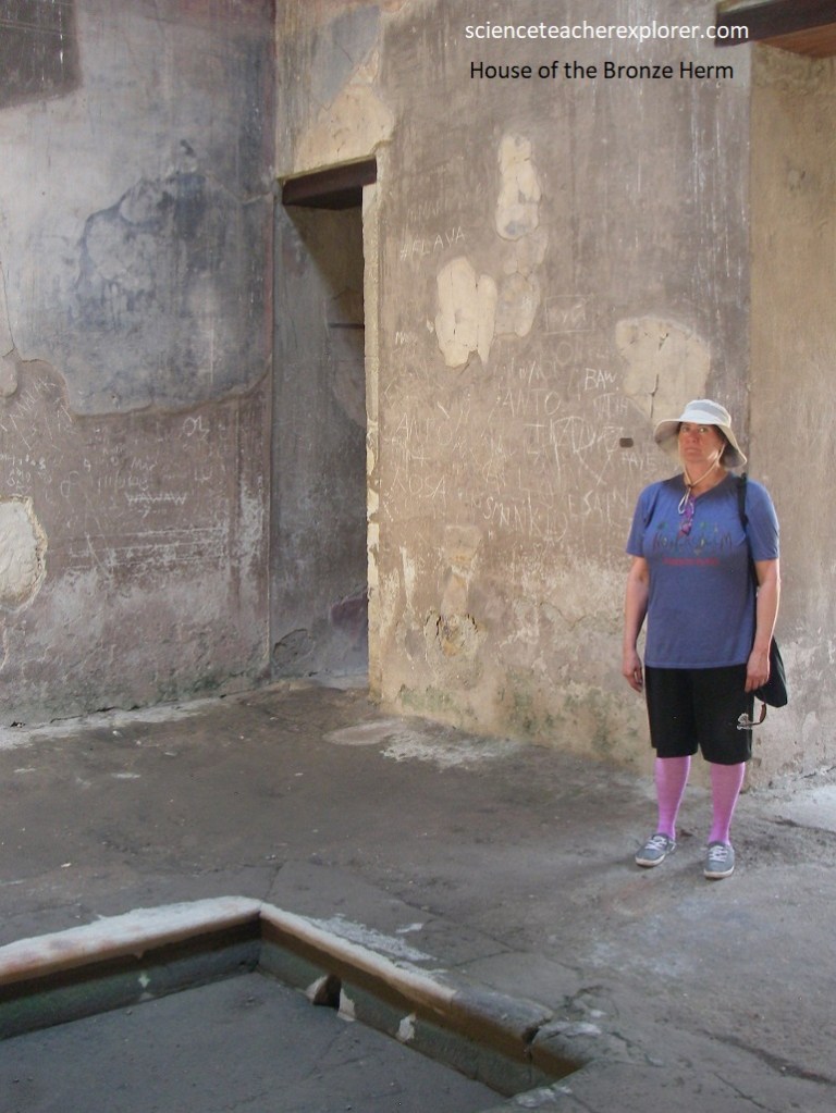 Across the street was, “The House with the Bronze Herm” (Casa dell’ erma bronzo). “This is one of the oldest houses in Herculaneum and has an elongated shape. The house got its name from a bronze Herma found in the tablinum, (a room that served as the office of the owner of the house), a place for personal meetings and storage of important documents. The Herma is a four-sided pillar with a sculpted head of a god, politician, or thinker. However, in this case, historians believe that the Herma is a portrait of the owner of the house, (pictured below).
