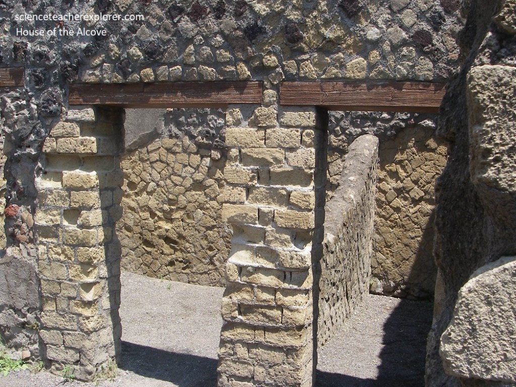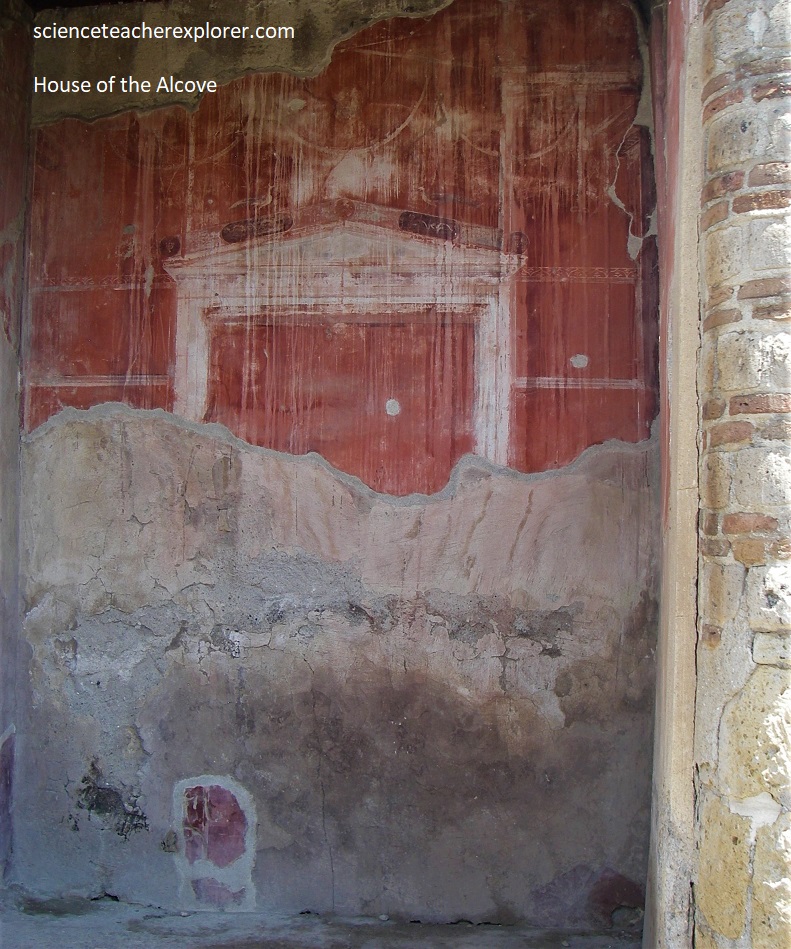 The front doorway of the “House of the Alcove” (Casa dell’ Alcova) led to the central courtyard, with colonnade on one side, leading to rear with garden courtyard and pseudo-peristyle (with two-sided colonnade, also steps down to central courtyard in previously separate house and corridor with light- well with single sided colonnade). Architecturally unusual, the suite here with apsed and vaulted rooms, give the house its name, (pictured below).