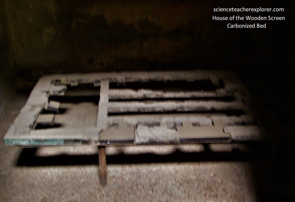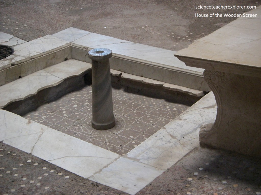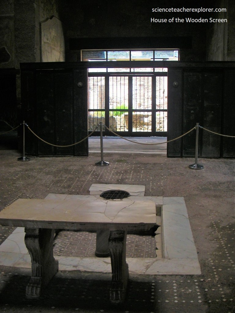 Further up the street of Cardo IV, was the “House of the Wooden Screen” (Casa Del Tramezzo Di Legno). This two floor house was noteworthy for its almost intact facade and inside, a wooden partition with hinges and lamp brackets, that closes the tablinum (tiny office) off the atrium.