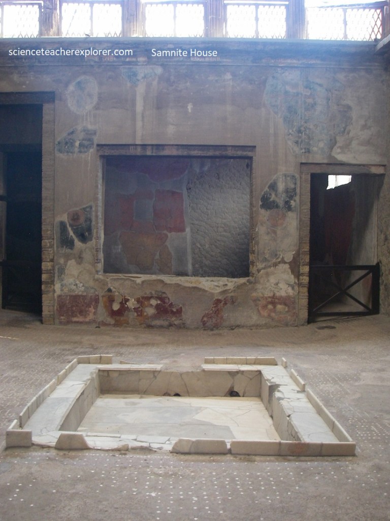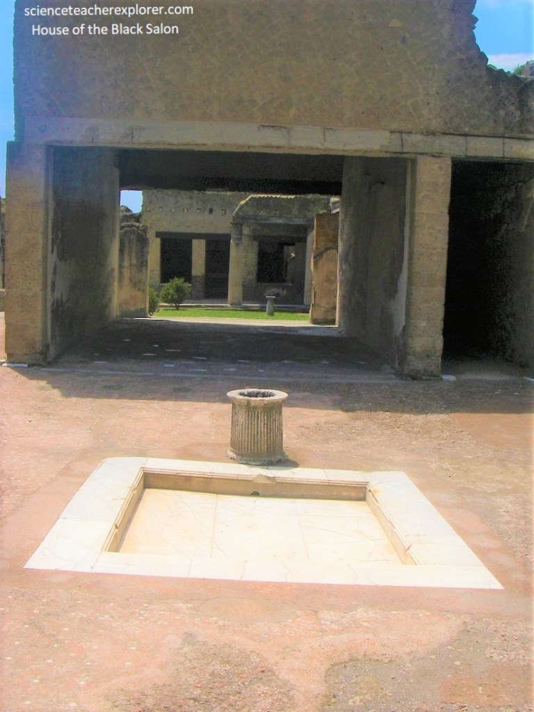 Pictured above, in the ‘Samnite House’, we entered the spacious and well-preserved atrium, paved in cocciopesto with rows of tesserae of white mosaic. In the center was the marble pool of the impluvium into which the rainwater was channeled through terracotta waterspouts in the form of dog’s heads.