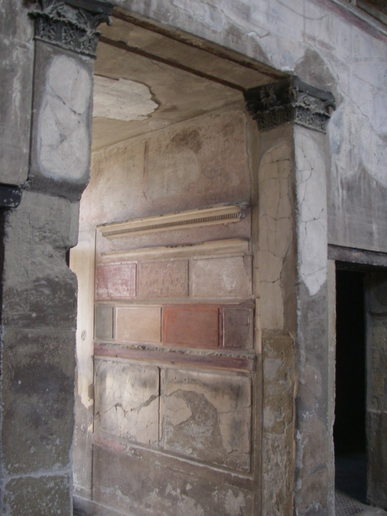 Pictured above, the great portal of the ‘Samnite House, with Corinthian-Italic capitals in tuff, led into the vestibule, decorated with a well-preserved wall decoration painted in different colors to imitate marble blocks, surmounted by a stucco cornice and a frieze, (in poor condition), featuring a fine landscape.