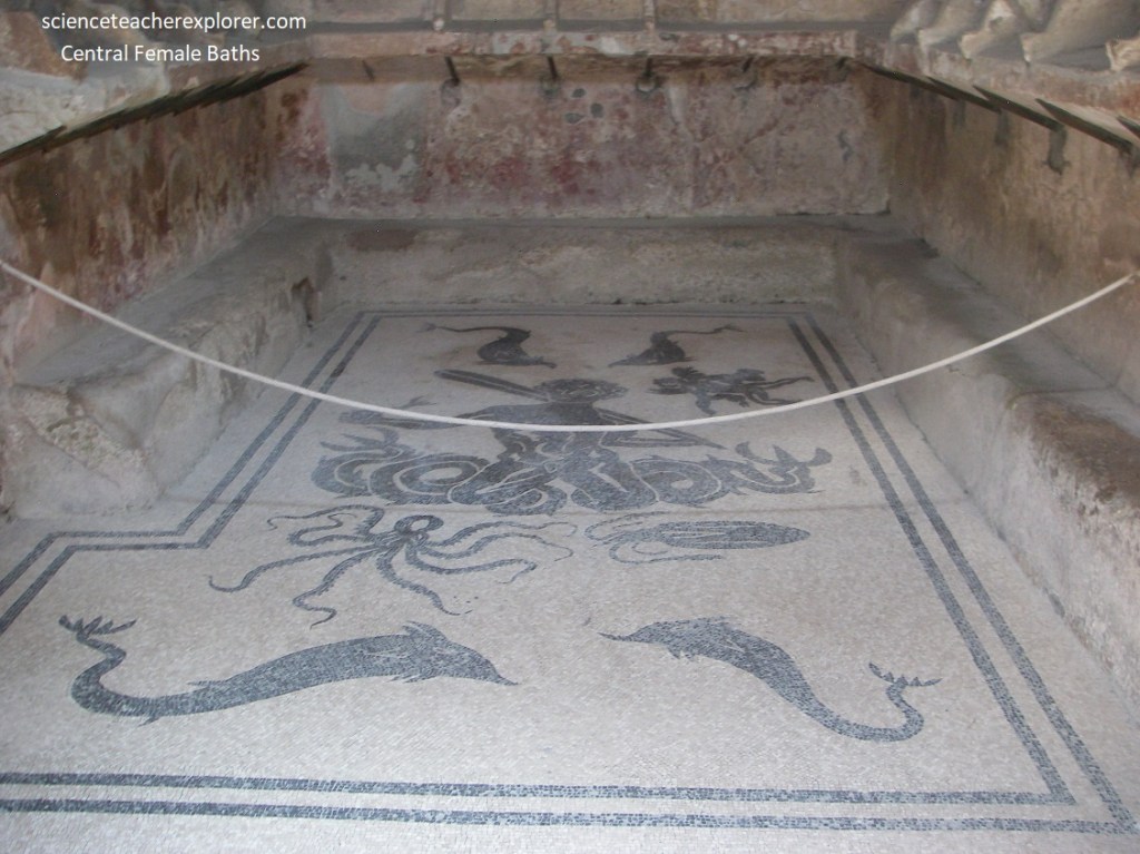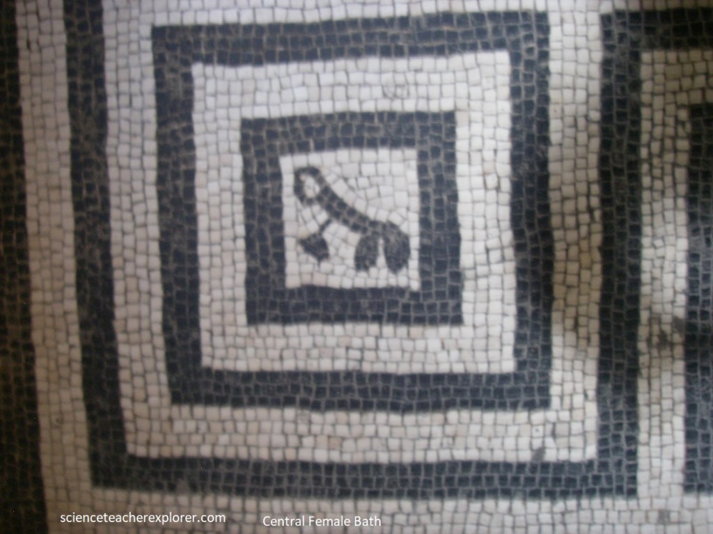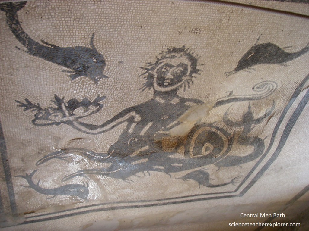 On the left, was a door into the frigidarium, a circular room with four apsed recesses, {I didn’t get a photo that worked out}. However, on the opposite side, Becky and I passed through an arched doorway to enter the spacious tepidarium of the Men’s Section. The area of passage featured suspensurae, the pilasters supporting the raised floor beneath which the hot air circulated, were clearly visible in cross section as the result of the collapse of areas of the mosaic pavement above. Pictured below, in the center of the white mosaic pavement, bordered by a black band, was a panel showing a sailing Triton with his head facing front, holding the helm in his left hand and a dish bearing fruit and a palm in the right, surrounded by four leaping dolphins.