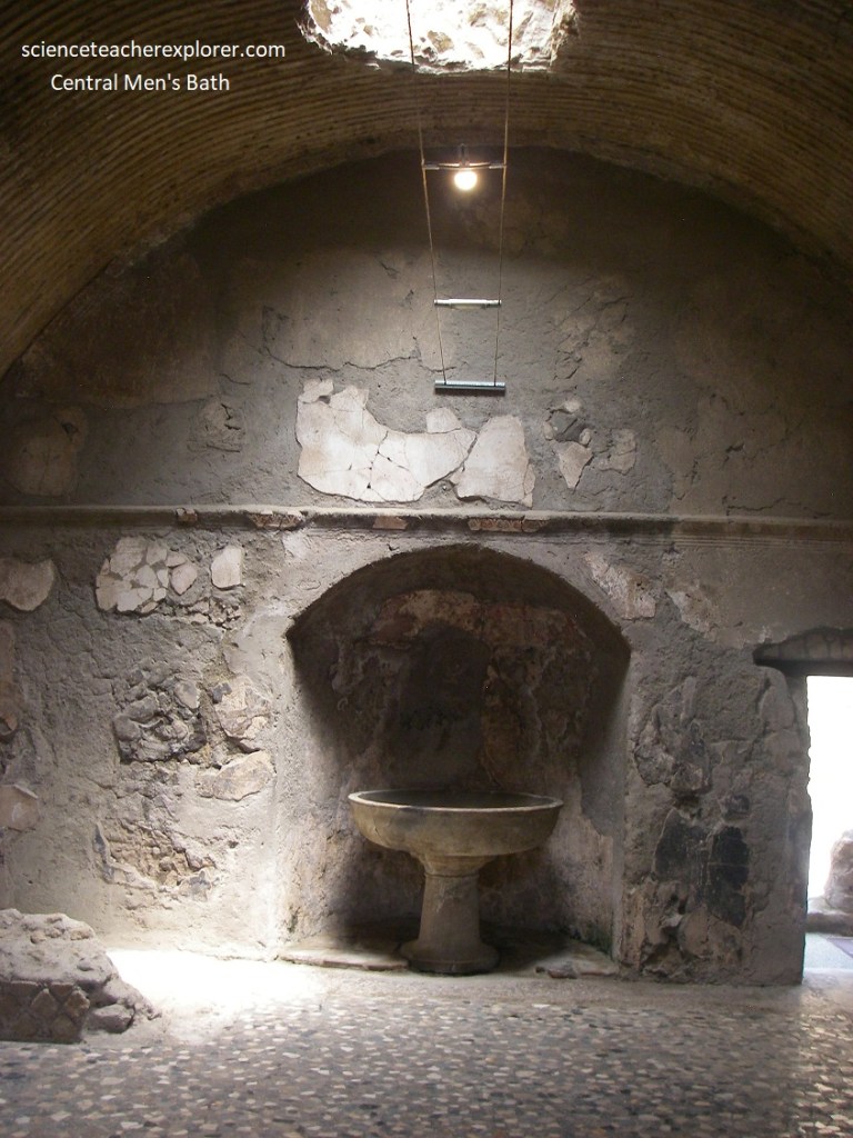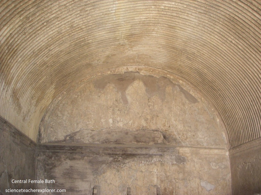 Pictured above, the ceiling of the apodyterium is vaulted, and features grooves (strigilature) designed to channel the percolating vapor.