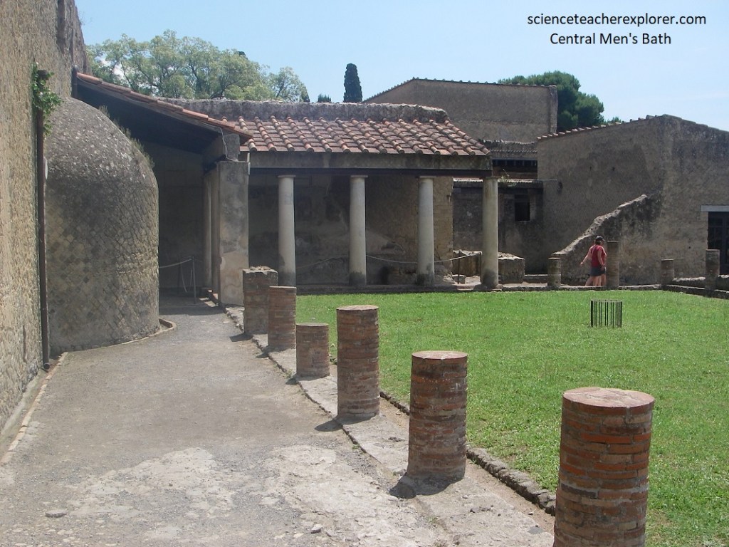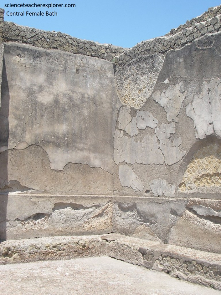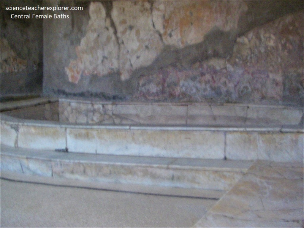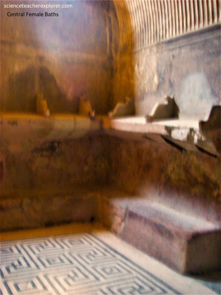 Across the street of Cardo IV, from the Samnite House, Becky and I found the ‘Baths of the Forum Women’s Section’. Pictured below, in front of the changing-room is a large square area, paved and faced with cocciopesto, equipped with benches made of masonry.