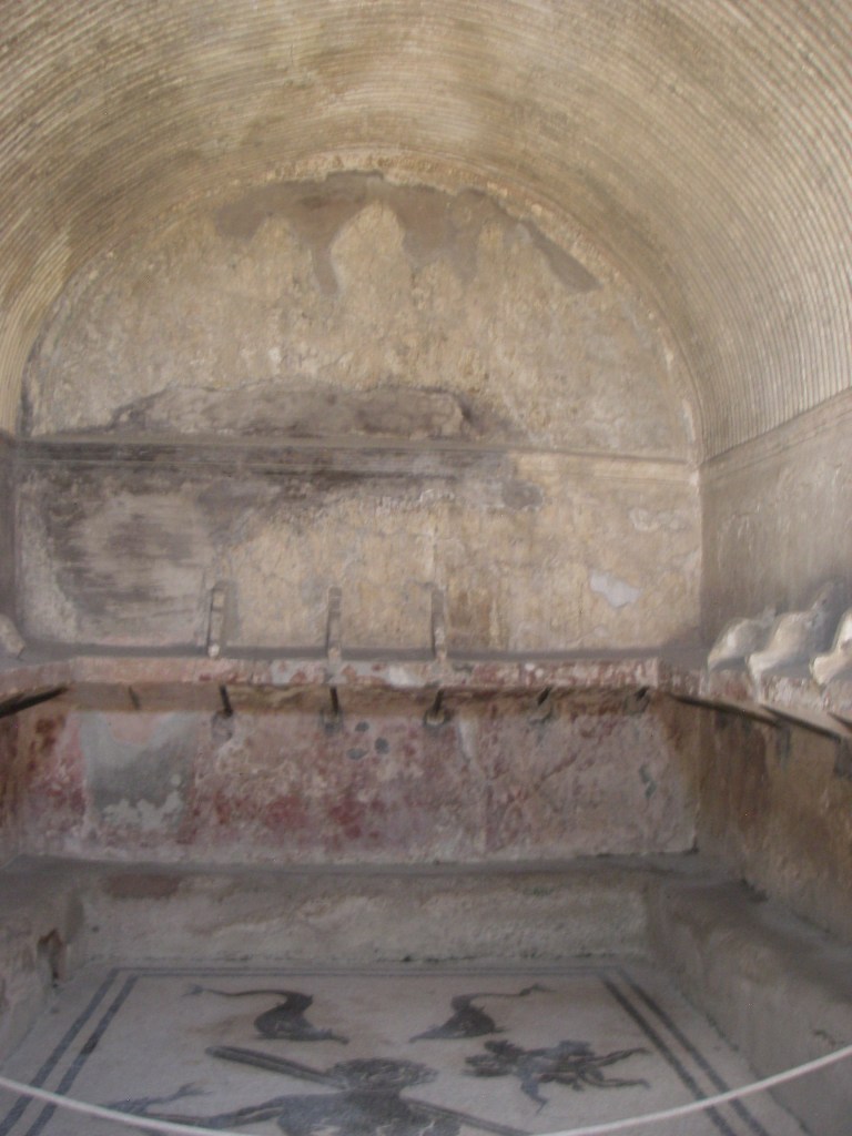 Pictured above, the apodyterium featured an elegant pavement of white mosaic bordered by a double black band, in the center of which is the figure of a front-facing sailing Triton, with an oar resting on his right shoulder and a wriggling fish in his left hand. Arranged around him are a Cupid with whip, an octopus, a cuttlefish and four dolphins. On the left of the apodyterium, was an arched doorway that led into the tepidarium, a rectangular room similar to the first, with stalls around the walls, (pictured below).