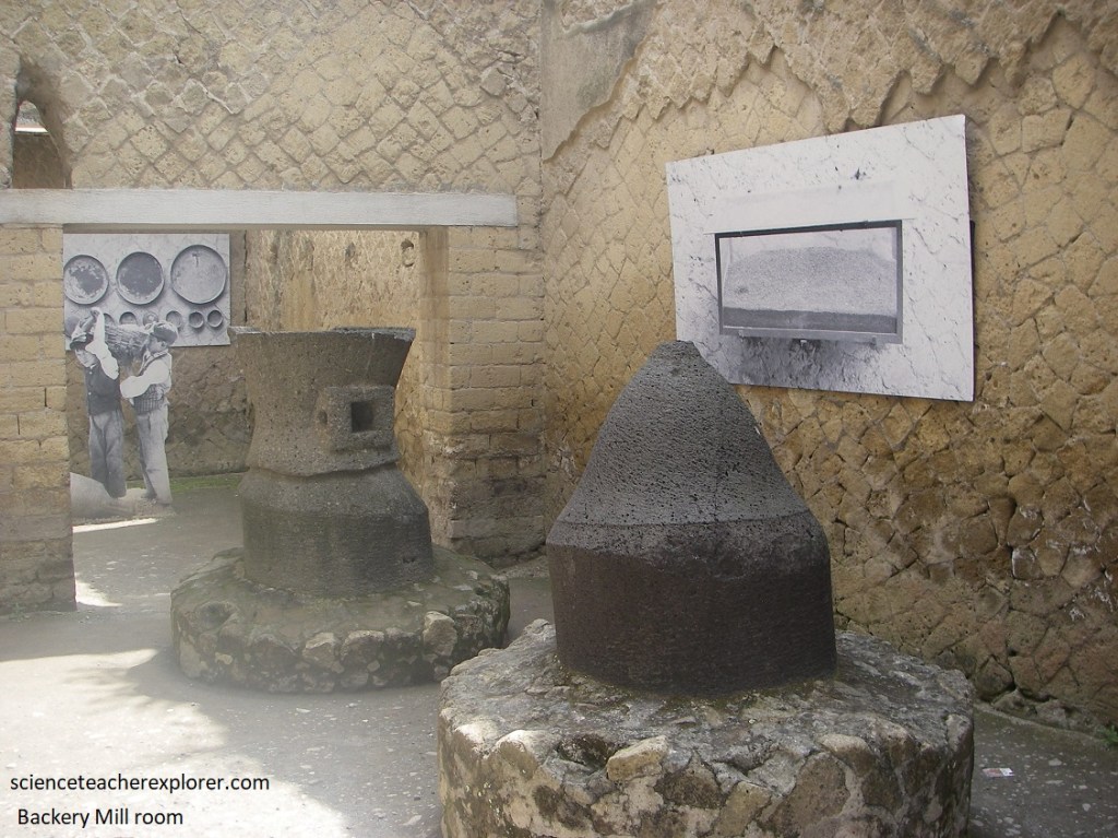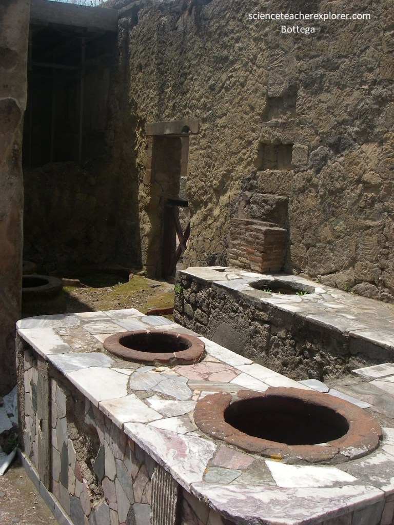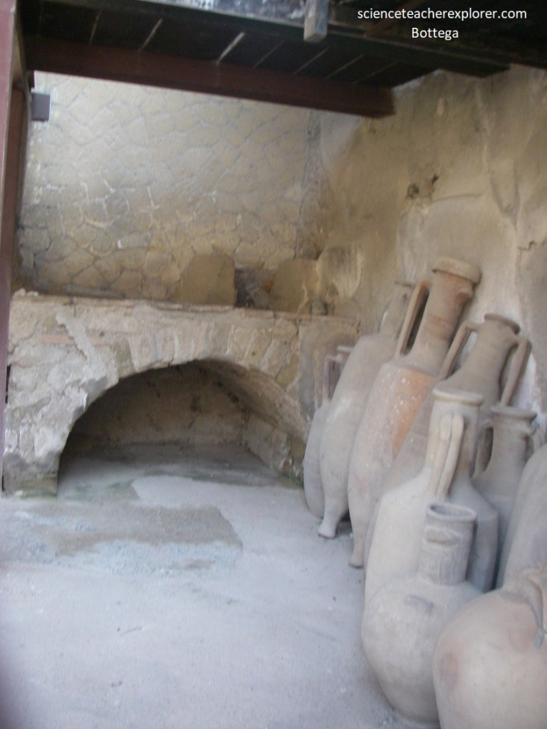 Pictured above, terracotta containers called amphorae are found in the Food-shop connected to the ‘House of Neptune and Anfitrite’. Alongside the wine amphorae, (used to hold the celebrated wine of the Vesuvius and Sorrento areas), there was an amphora for dried fruit and also a Cretan wine amphora which contained a sort of sweet white wine, (a type of Malvasia), the only type drunk in ancient times by women.