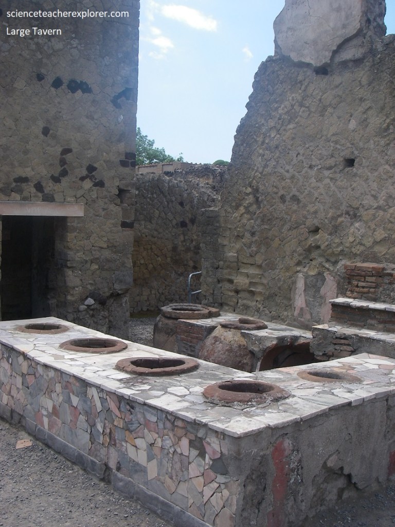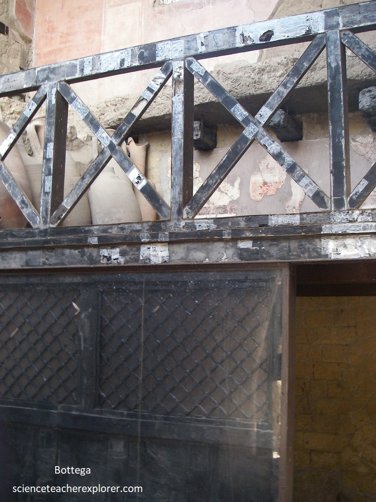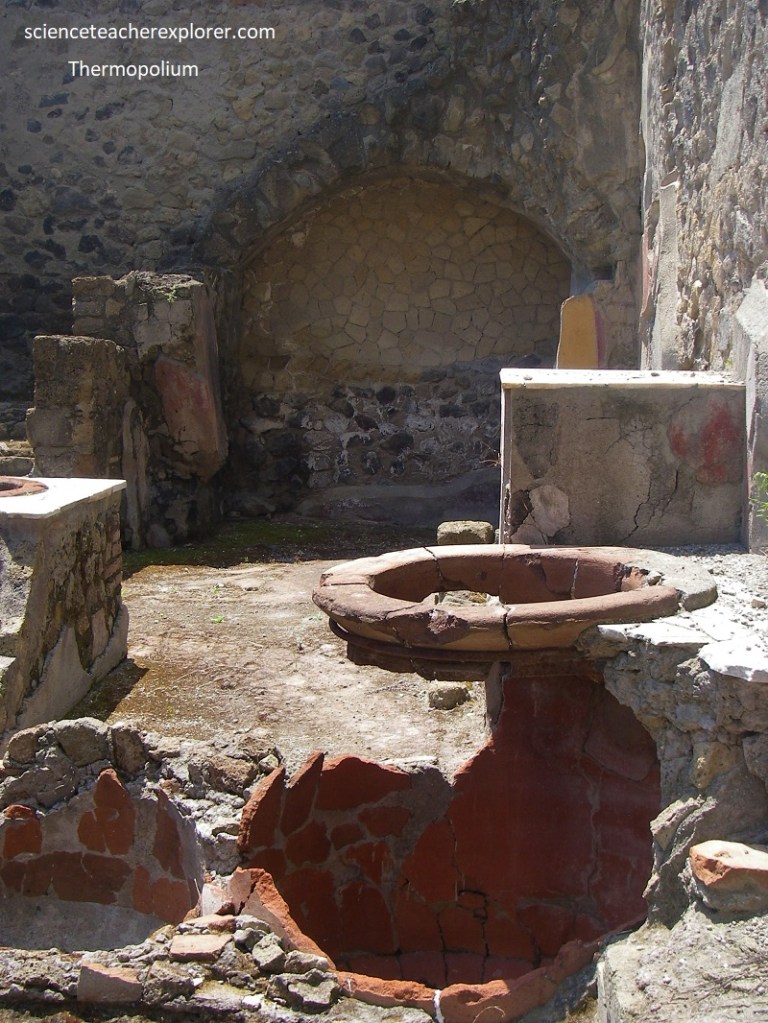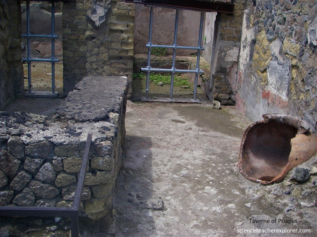 Beck and I visited the Men’s Section calidarium, but we again didn’t get a good picture of it. We then retraced our steps back to Cardo IV, where we turned left up towards Decumano Massimo. However, to the right we came across the Bottega Di Generi Alimentari, (food-shop), [Pictured below].