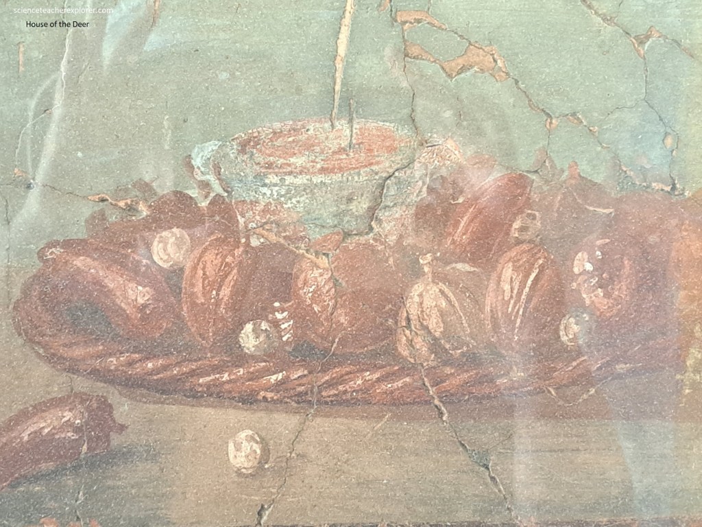 The covered atrium for the ‘House of the Deer’, was very small. to the right a long corridor led directly to the kitchen, (pictured above). The the left, instead, we entered a large cryptoporticus with windows, paved with shite mosaic decorated with a black band and rows of polychrome marble chips. The walls had elegant frescoe-decorations with pictures of a sea-scape and baskets containing fruit, dates, figs and walnuts, (pictured below).